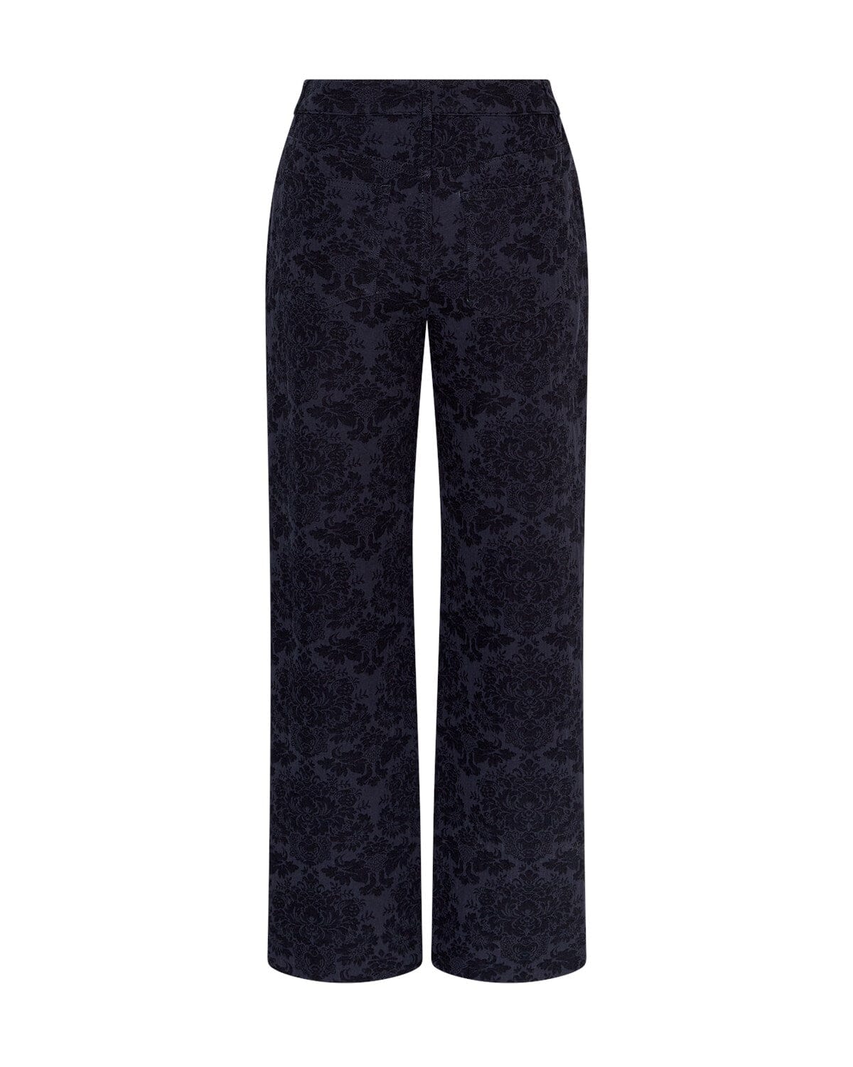 Byxor från Moss Copenhagen i mörkblå färg med blommigt tryck. Byxorna har hög midja och vida ben i ankellängd.