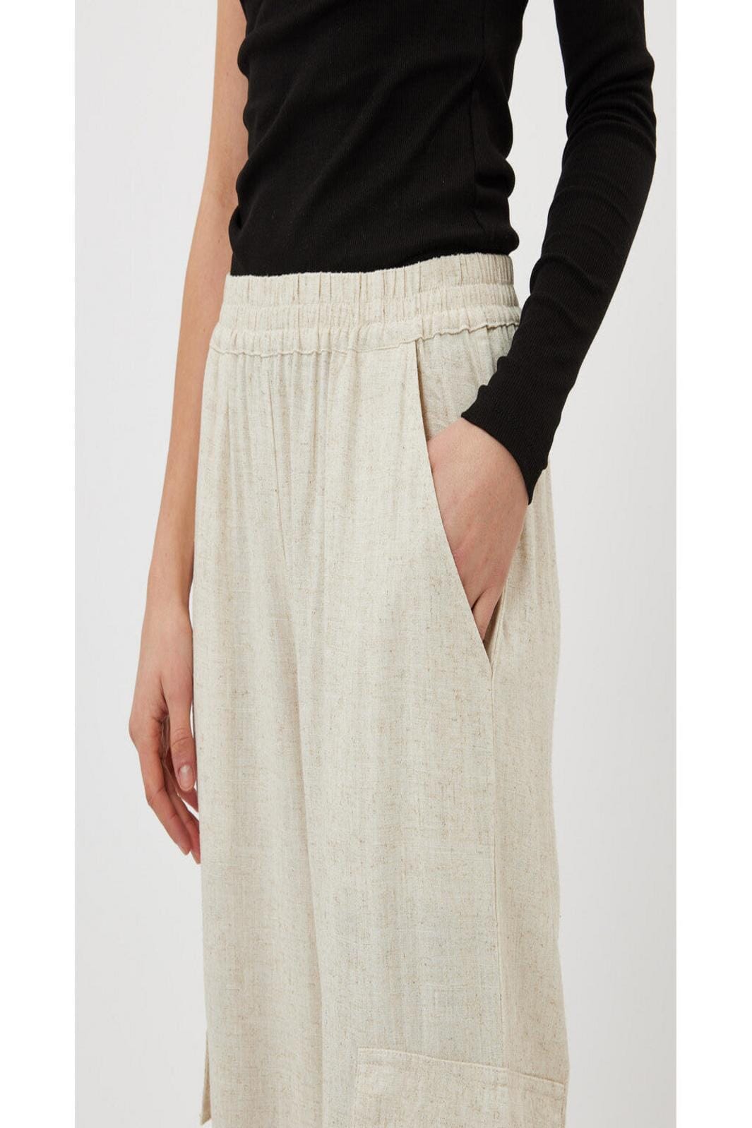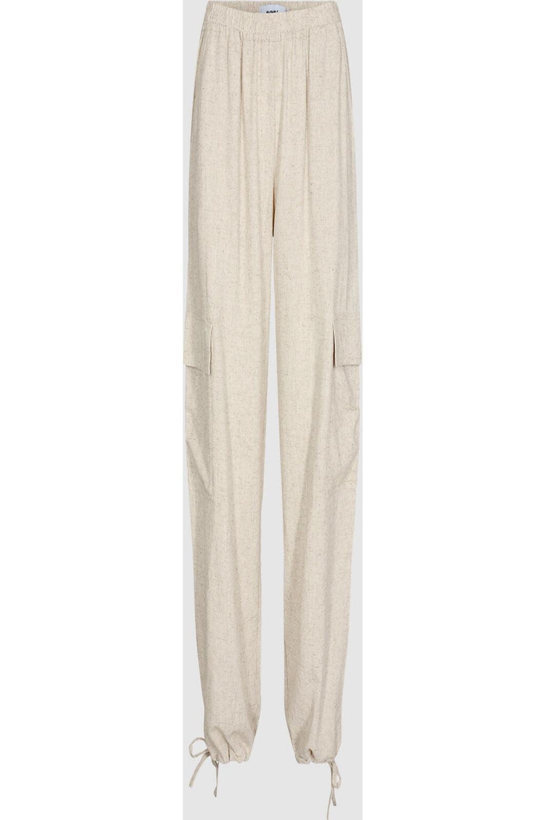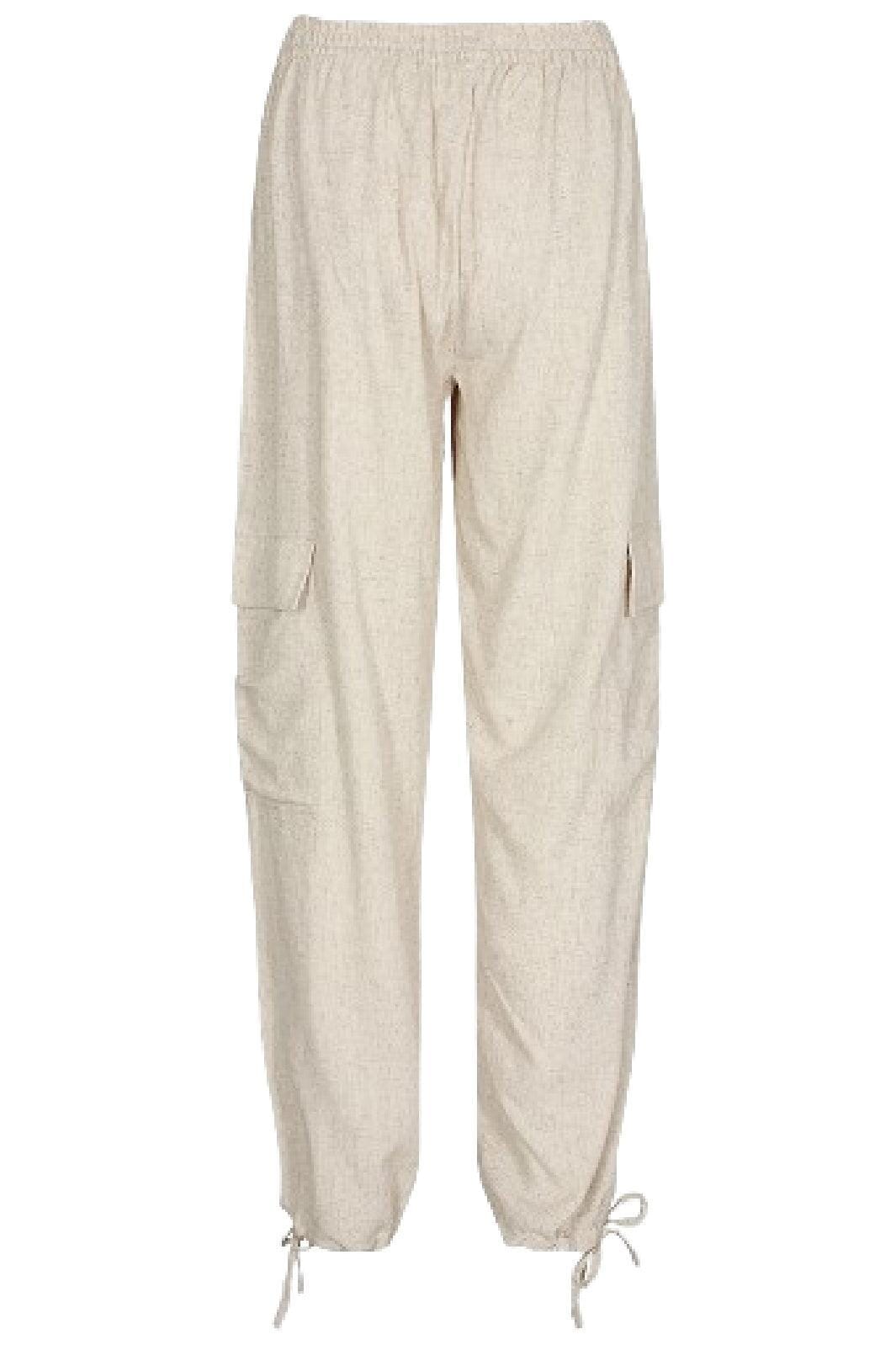 Cargo-byxor från Moves i sandfärgad viskos och linne. Byxorna har en lös passform med elastisk midja och snörning, praktiska cargofickor och snördetaljer vid anklarna.