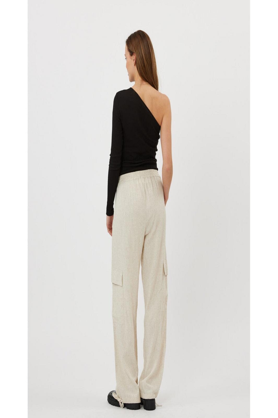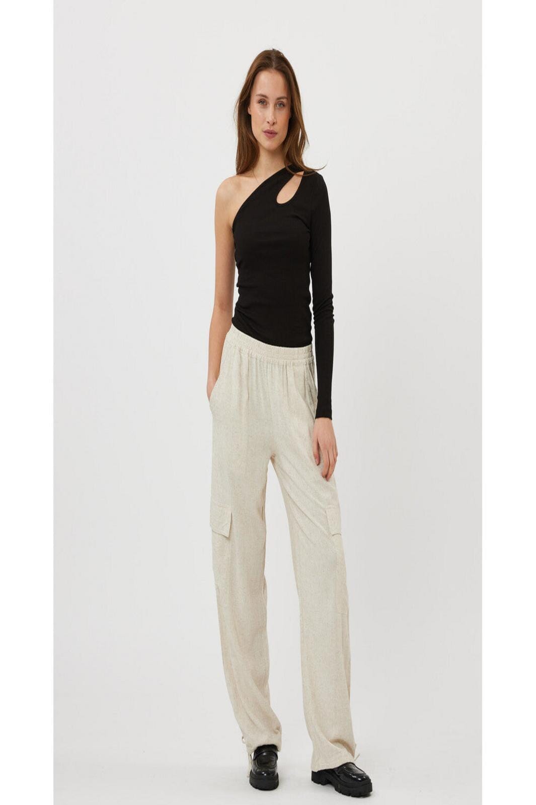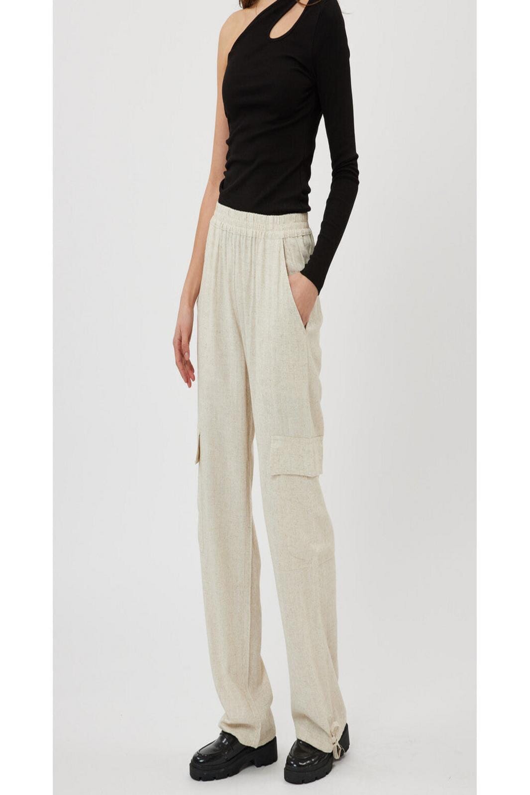 Cargo-byxor från Moves i sandfärgad viskos och linne. Byxorna har en lös passform med elastisk midja och snörning, praktiska cargofickor och snördetaljer vid anklarna.