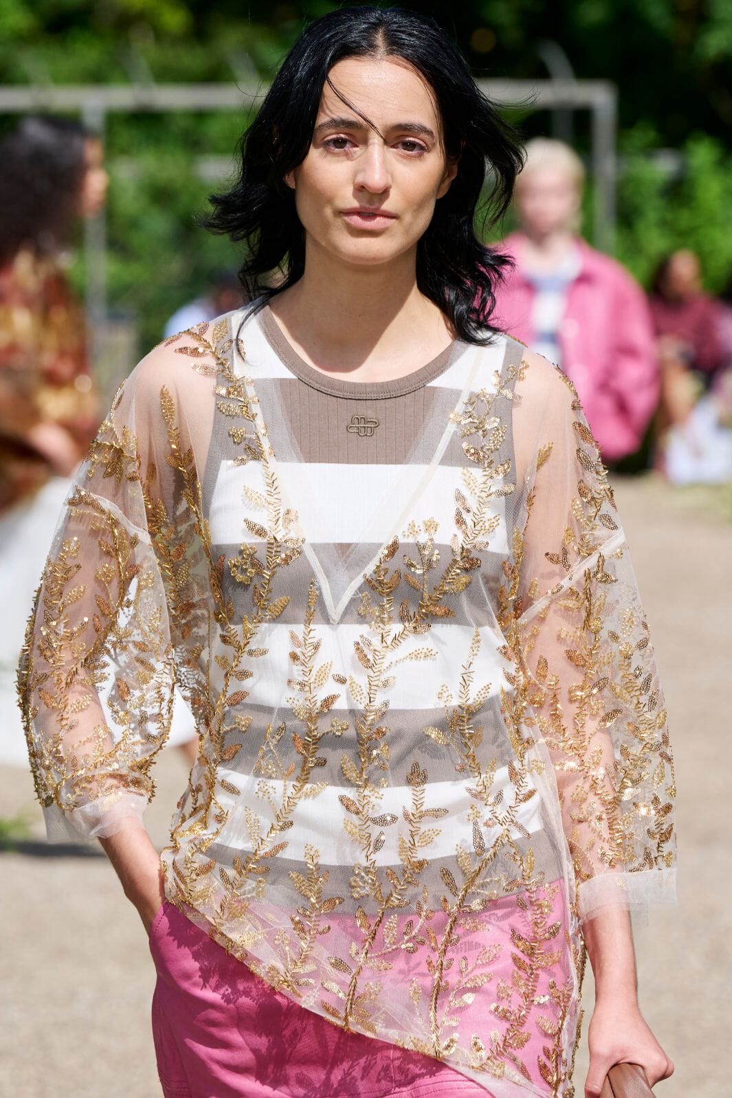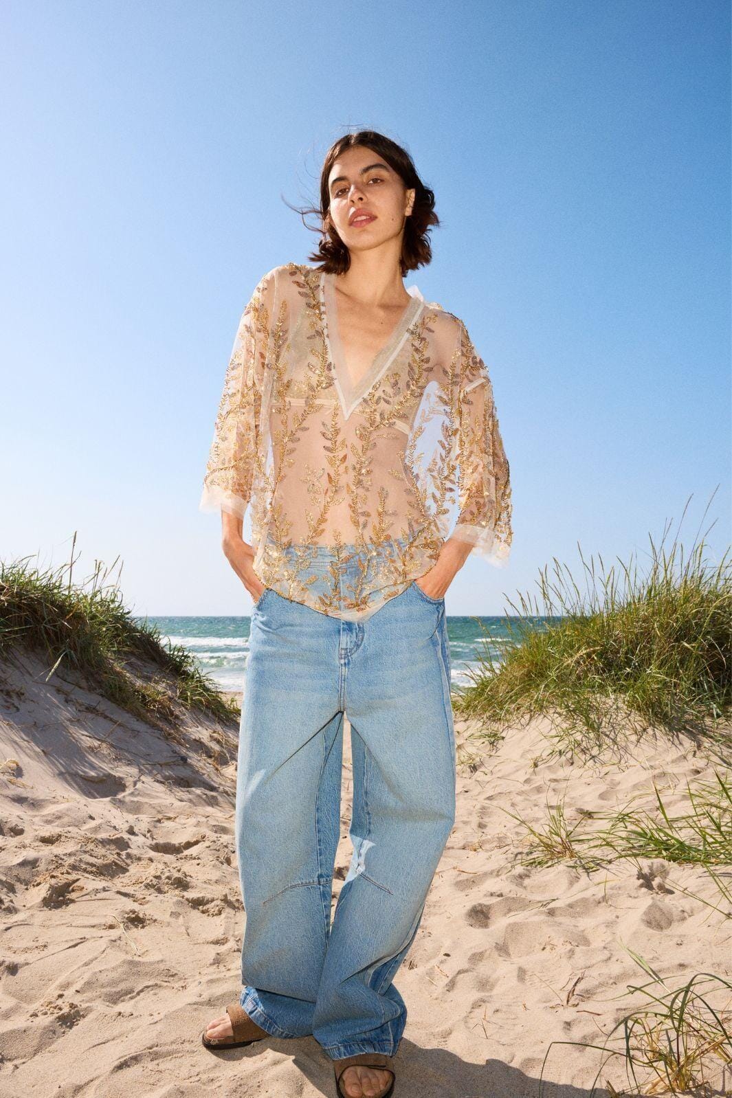 Gyllene topp från Munthe, tillverkad i transparent polyester med gyllene broderier, paljetter och pärldetaljer i ett bladmotiv över hela toppen.