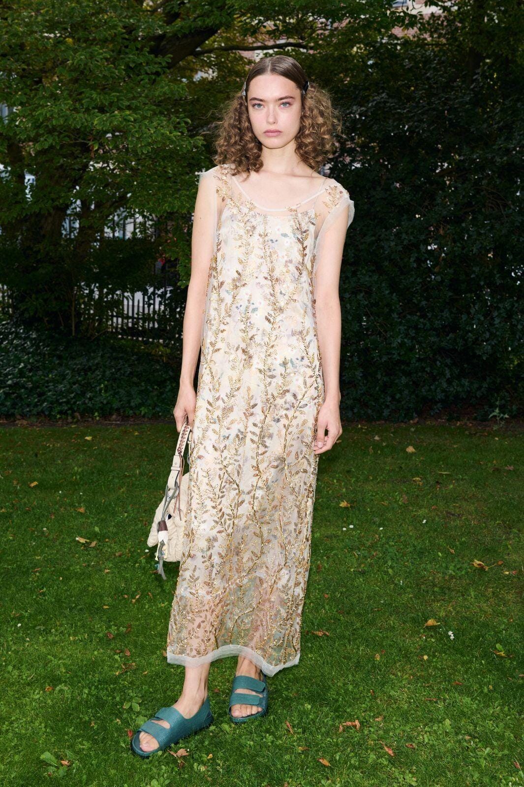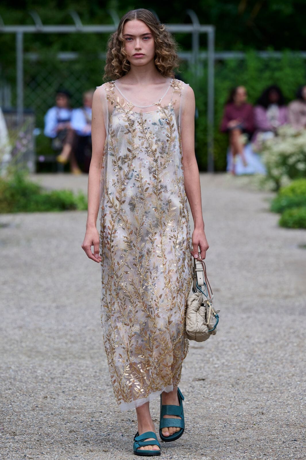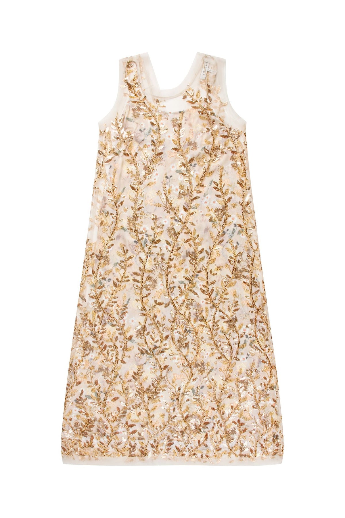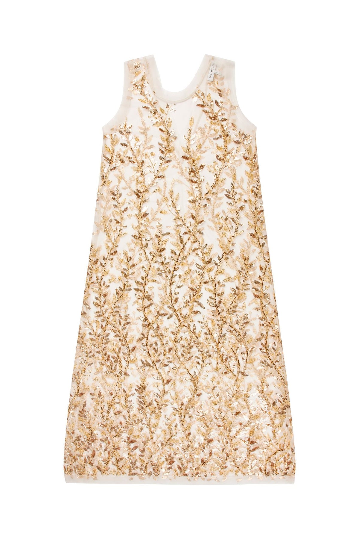 Klänning från Munthe i guld med ett blommönster skapat av broderi, paljetter och pärldetaljer arrangerade i ett bladformat mönster på semitransparent tyg.