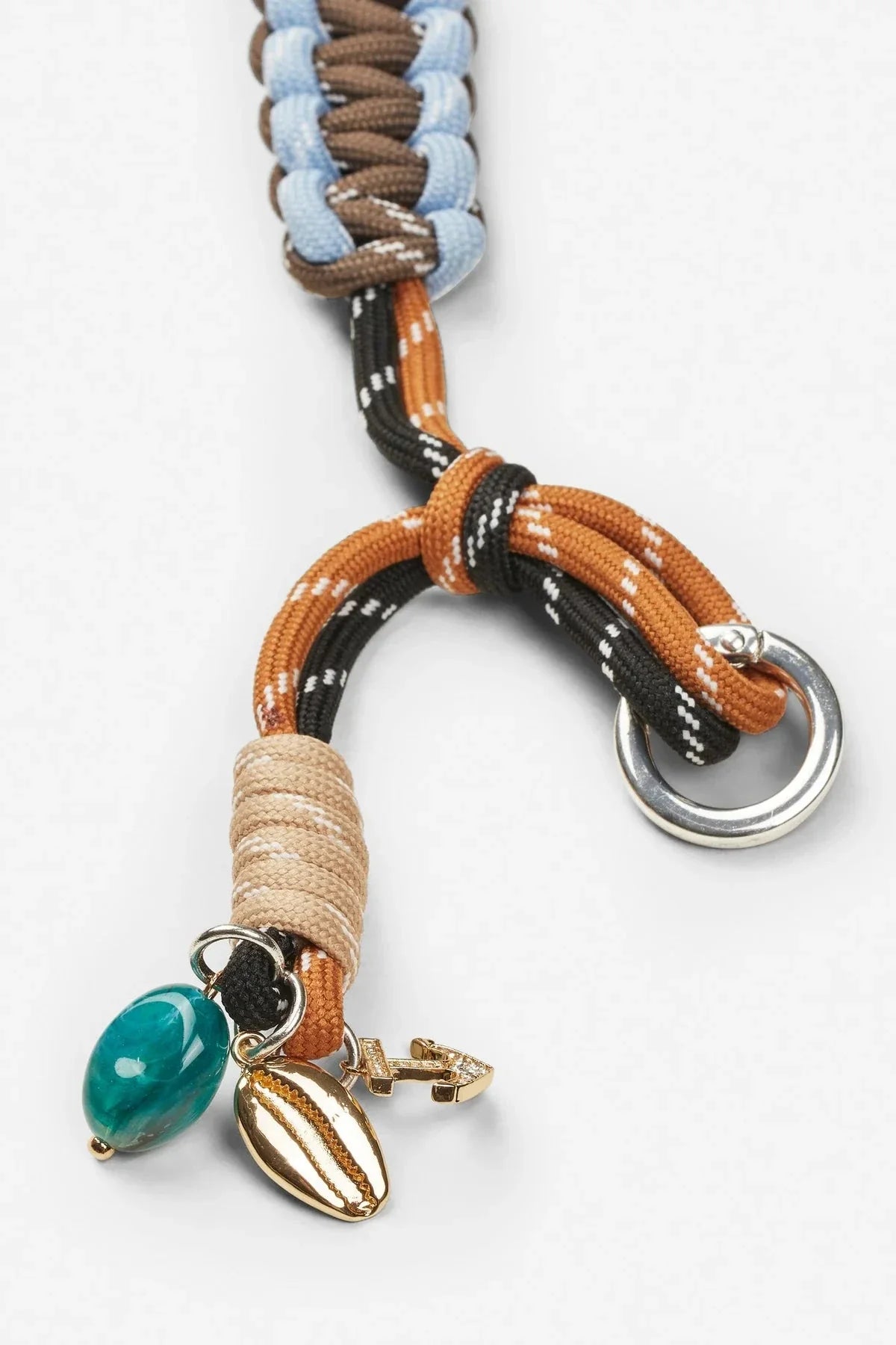 Väskremmen från Munthe är gjord av flätat rep i blå och bruna nyanser. Remmen är avtagbar och har dekorativa hängen i ändarna.