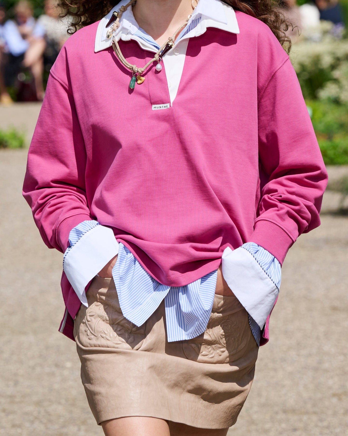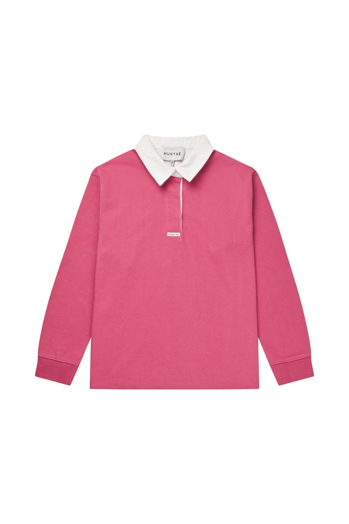 Långärmad polotröja från Munthe i en rosa-lila bärfärg. Tröjan har vita detaljer på kragen och muddarna.
