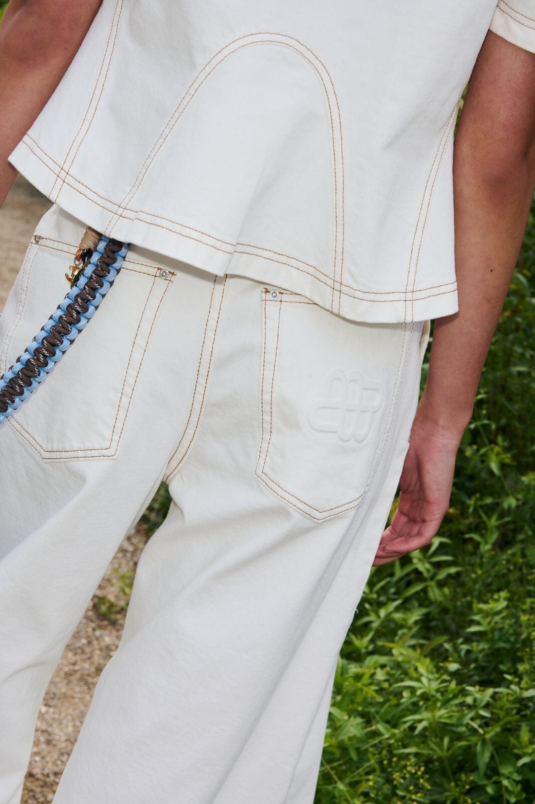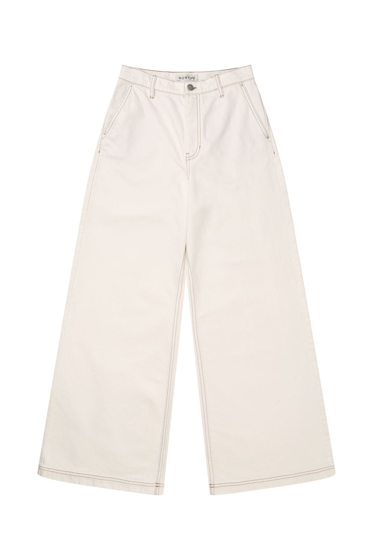 Byxor från Munthe i en ljus elfenbensfärg. De är tillverkade av 99 % ekologisk bomull med 1 % elastan.