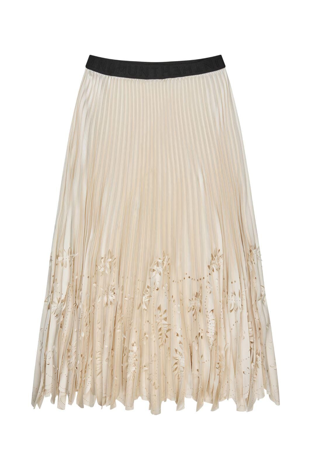 Plisserad kjol från Munthe i en krämig offwhite nyans. Kjolen är gjord av 100 % återvunnen polyester och har laserskurna blomutskärningar i den nedre delen.