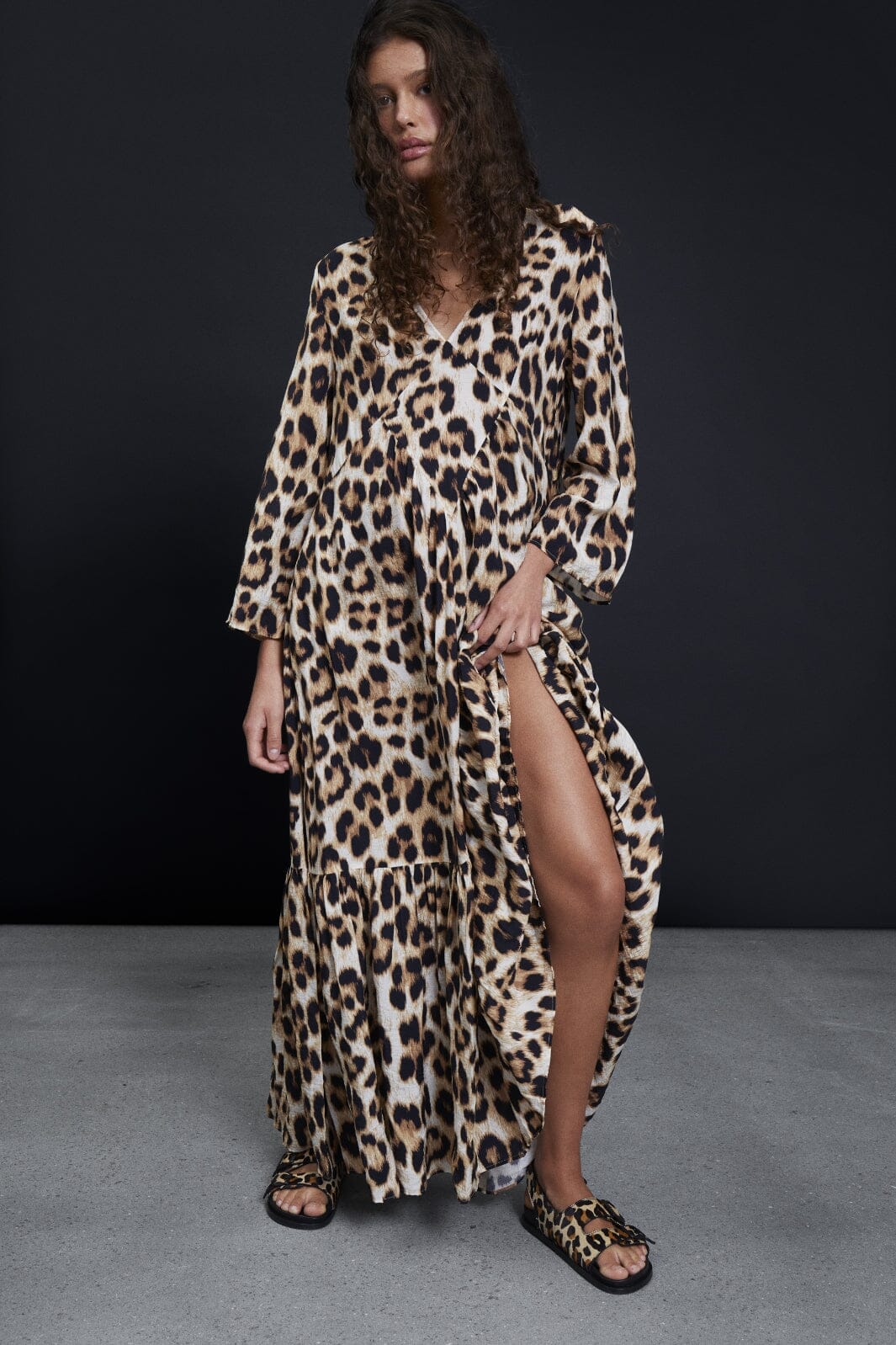 Lång klänning från Munthe i mocca-färgad leopardtryck. Klänningen har en djup V-ringning, bindband på ryggen och rutformad sömnad fram.