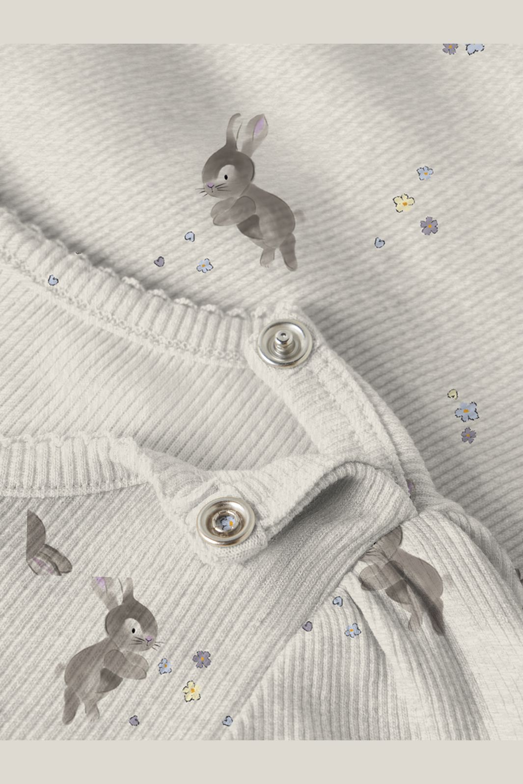 Långärmad body från Name It med tryck av små kaniner och blommor på en beige melerad botten. Ribbstickat tyg har en vertikal, randig struktur.