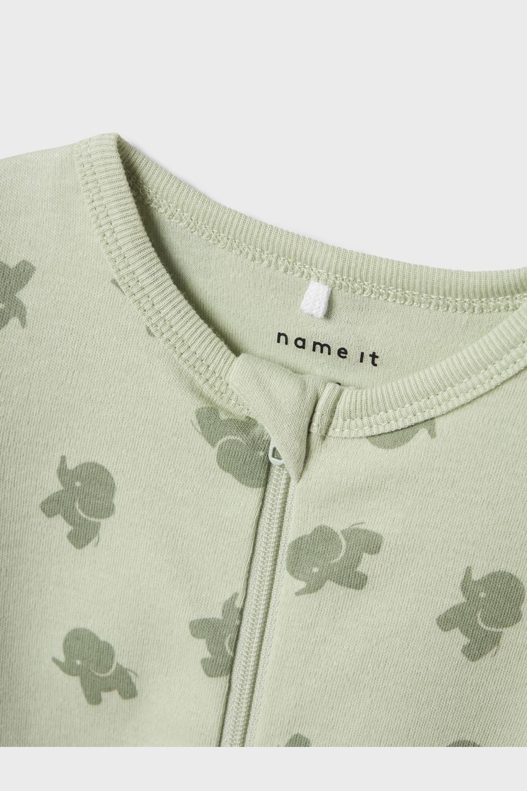 Pyjamasoverall från Name It i ljusgrön färg med elefanttryck. Overallen har en dragkedja från hals till ben och är gjord av en blandning av ekologisk och vanlig bomull.