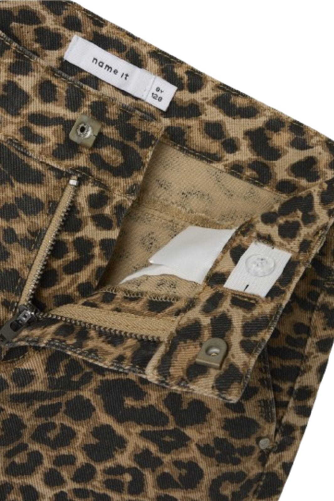 Brede twillbyxor från Name It med leopardtryck i beige och bruna nyanser. Byxorna har fram- och bakfickor samt krokknapp- och dragkedjestängning.