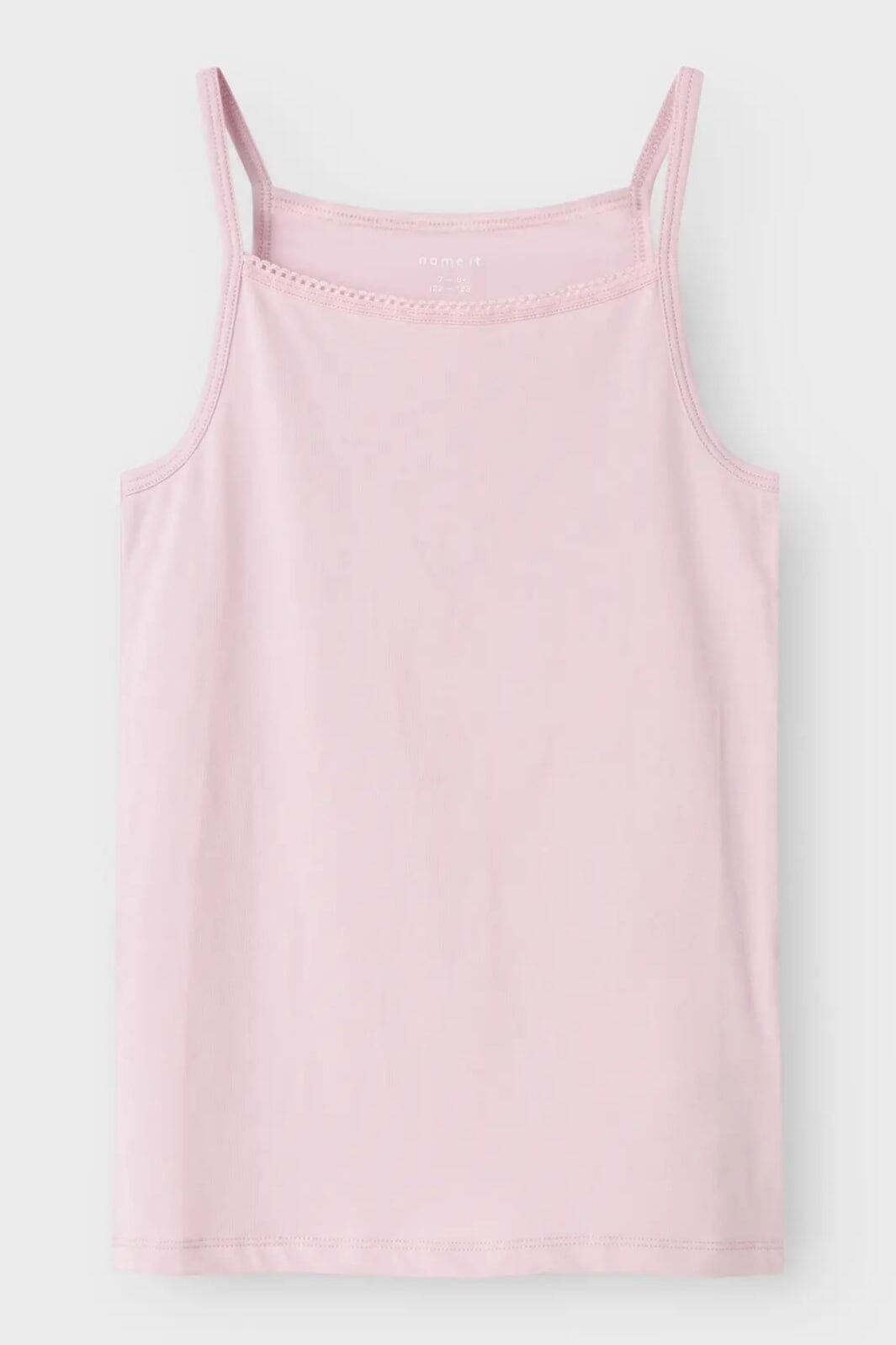 Tvåpack med linnen från Name It. Den ena toppen har små hjärtan mönster, medan den andra är enfärgad ljusrosa. Båda topparna har justerbara spaghetti-band och spetsdetaljer.