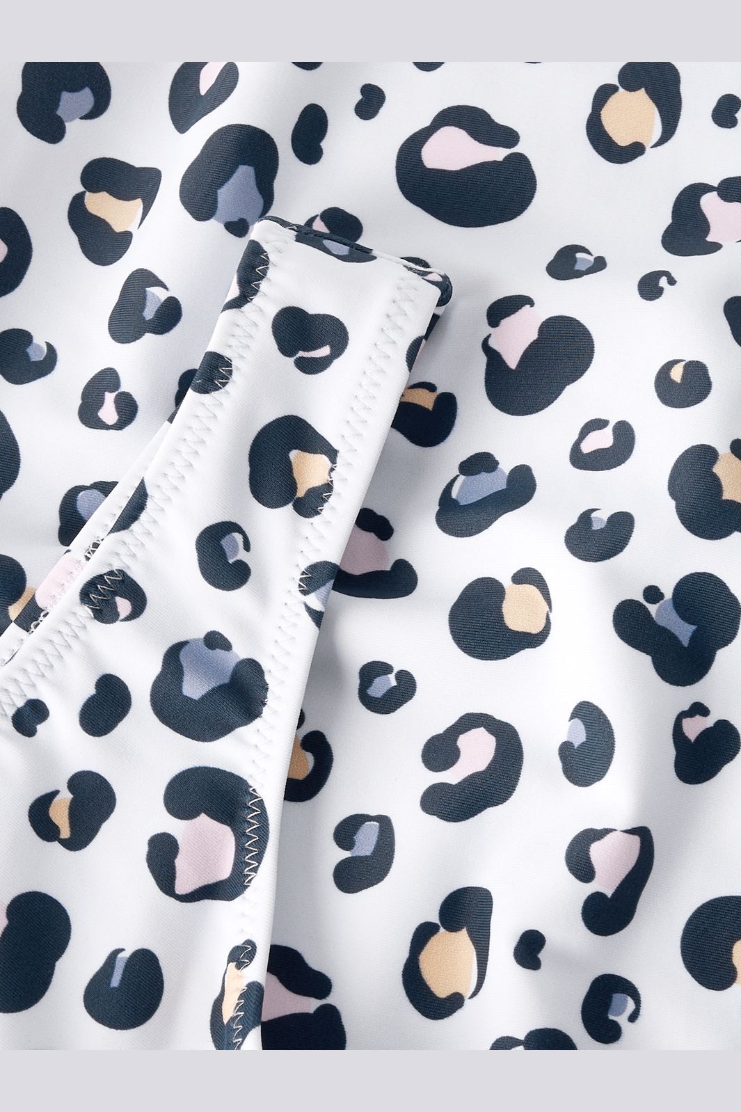 Baddräkt från Name It med leopardmönster i svart, rosa och beige på vit bakgrund. Baddräkten har breda axelband och rund halsringning.