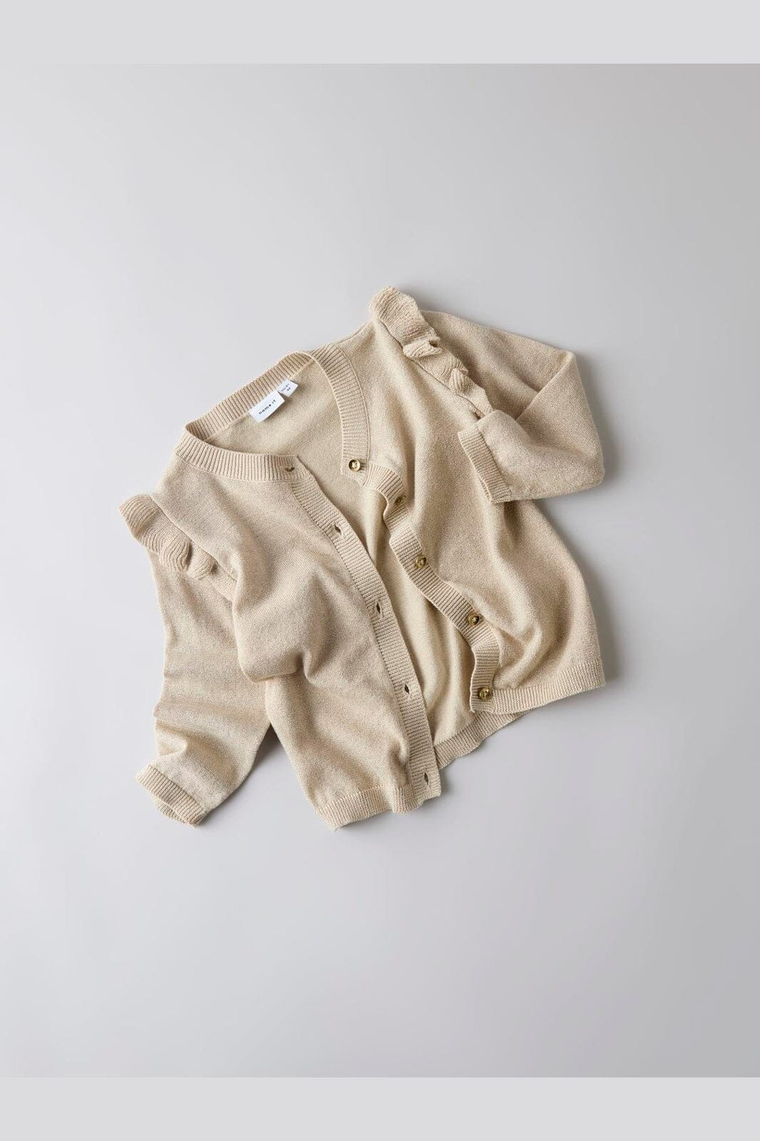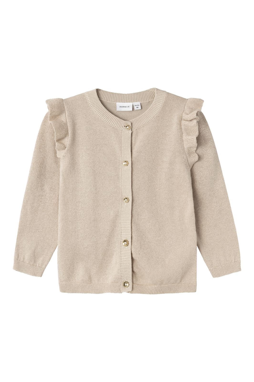 En beige stickad kofta från Name It med en lätt skimrande effekt. Koftan har rynkade axlar och guldfärgade knappar.