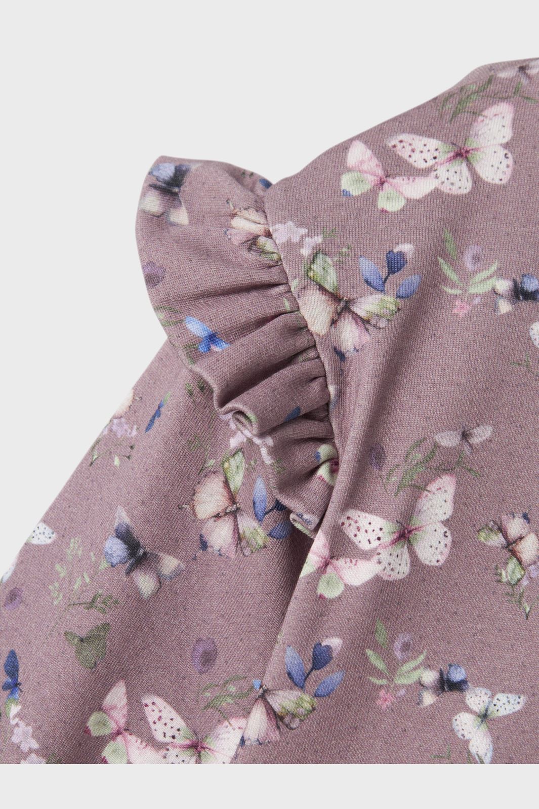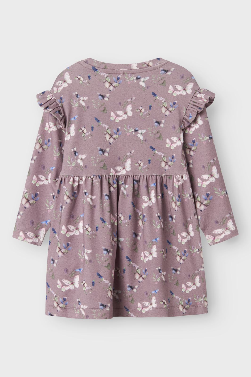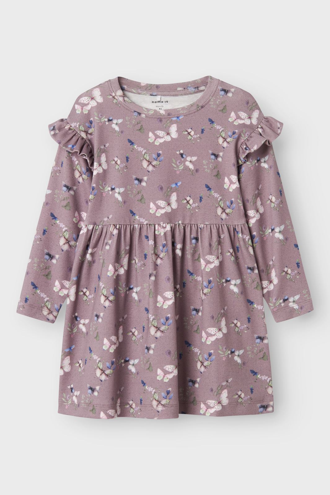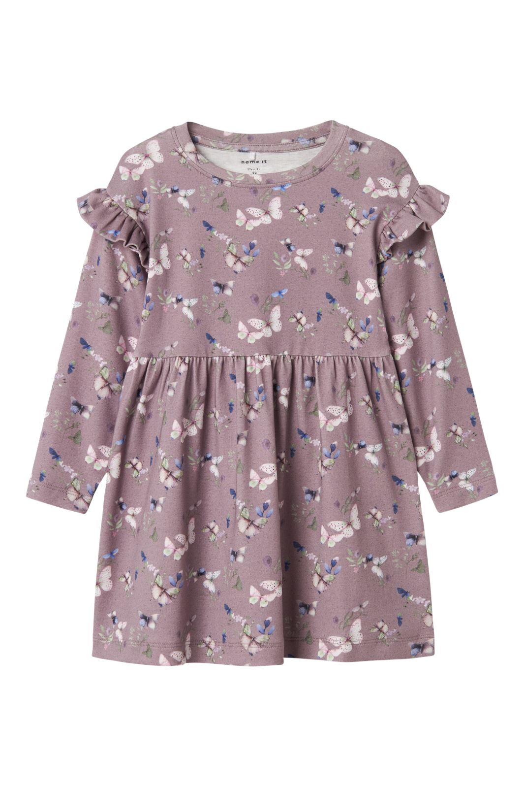 Lila klänning med fjärils- och blommönster från Name It. Klänningen har långa ärmar, rund hals och volangdetaljer vid axlarna. Knälängden ger god rörelsefrihet.