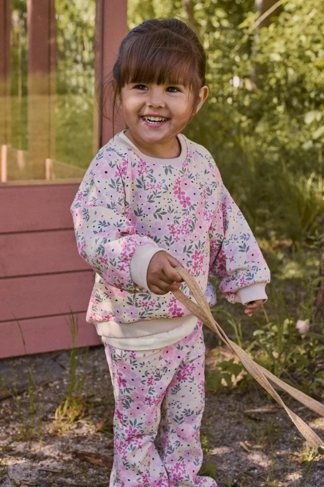 Sweatshirt från Name It med blommigt mönster i rosa och gröna nyanser på en beige botten. Sweatshirten har ribbade muddar och en ribbad kant nedtill.