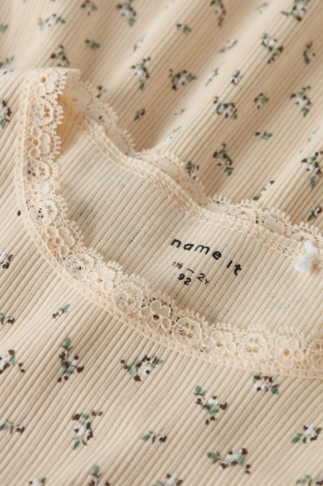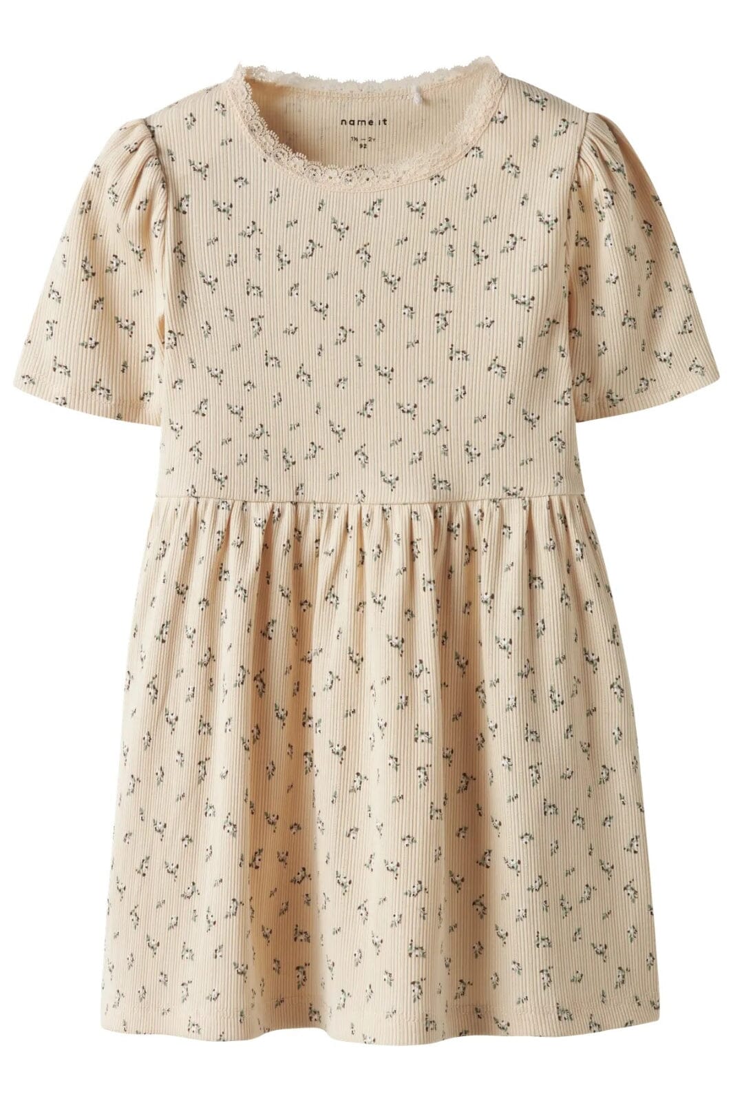 Ljus beige klänning från Name It med små gröna och bruna blommor. Klänningen har korta puffärmar och en O-halsringning med spetskant. Slim fit-passformen ger en åtsittande silhuett.