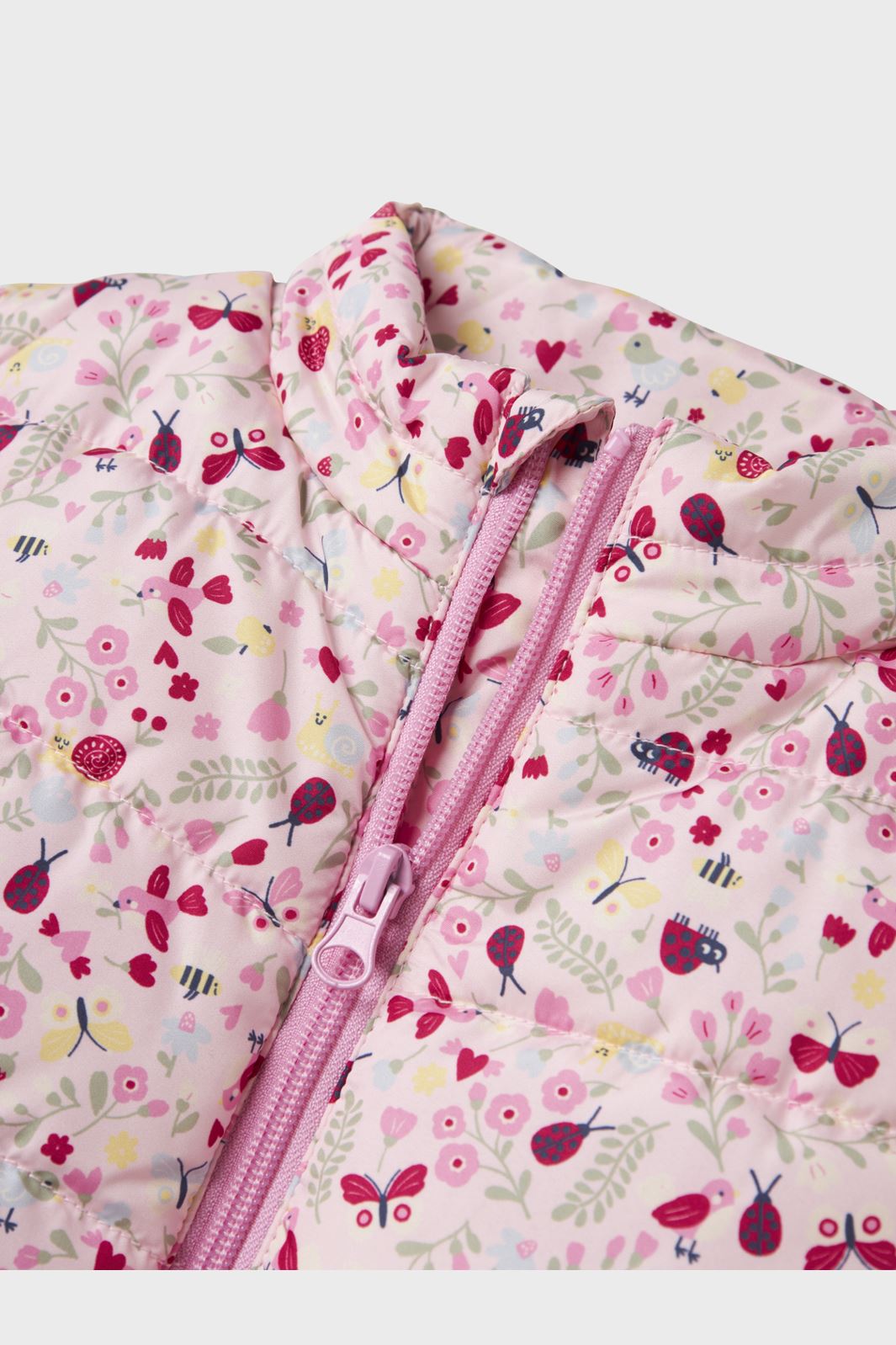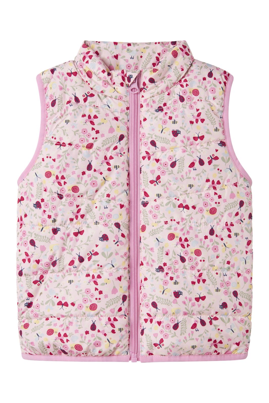 En ärmlös väst med hög krage från Name It. Den rosa västen har ett mönster med blommor och nyckelpigor på ljus bakgrund och stängs med dragkedja fram.