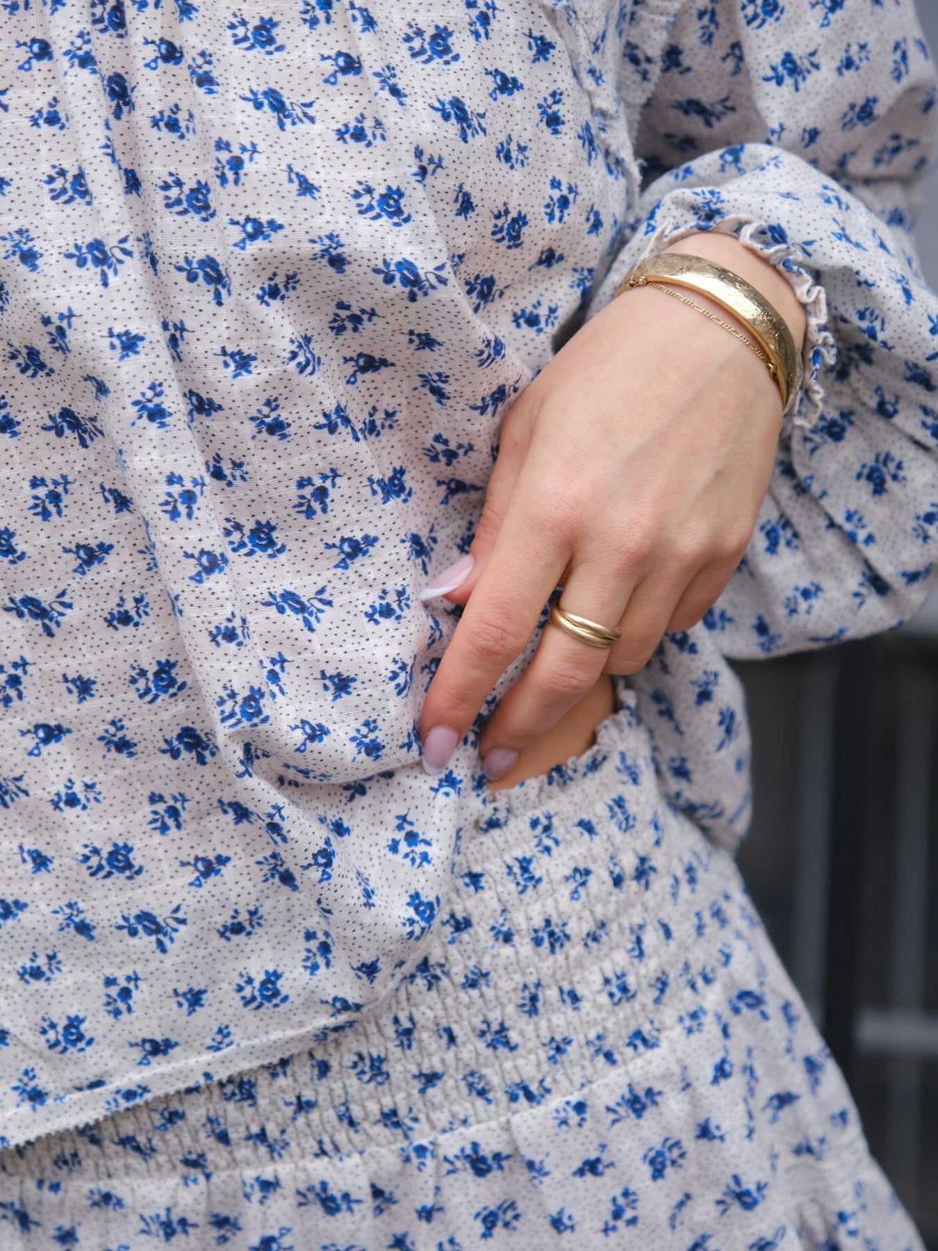 Blå kjol med blommor- och pricktryck. Kjolen har en smockdetalj i midjan och ett lager av rynkeffekter. Det blå och vita mönstret skapar ett fräscht uttryck.