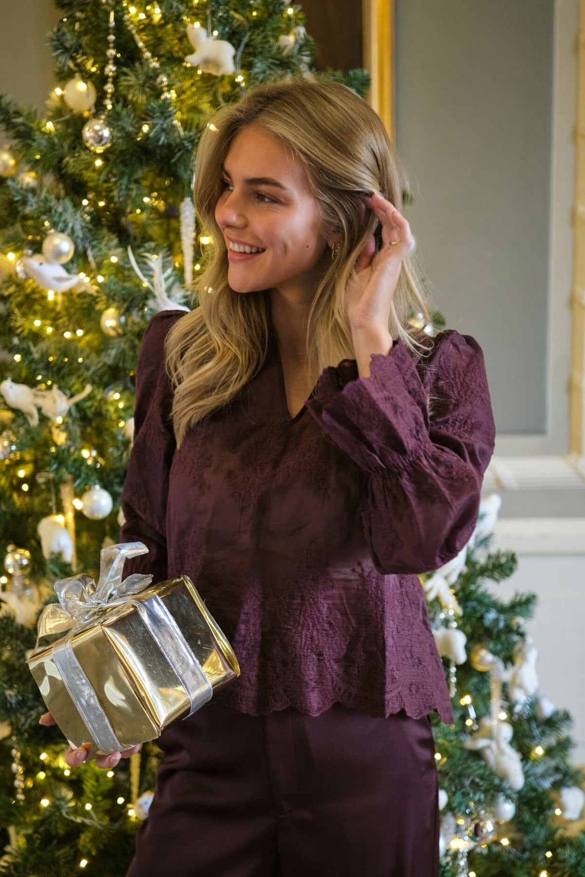 Broderad blus från Neo Noir i en djup burgundfärg. Blusen har ett blommönster i broderi över hela tyget, v-ringad hals och långa ärmar med rynkade manschetter.