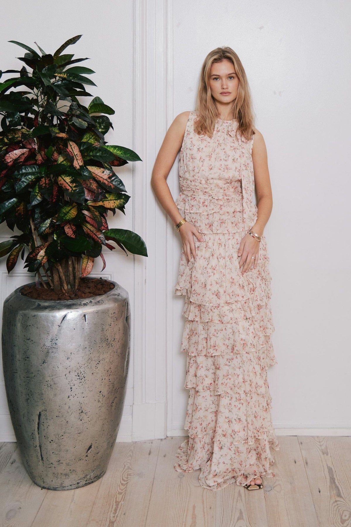 Ärmlös topp från Neo Noir med blommigt tryck i rosa och gröna nyanser på en cremefärgad bakgrund. Toppen har en hög halsringning och en smal passform.