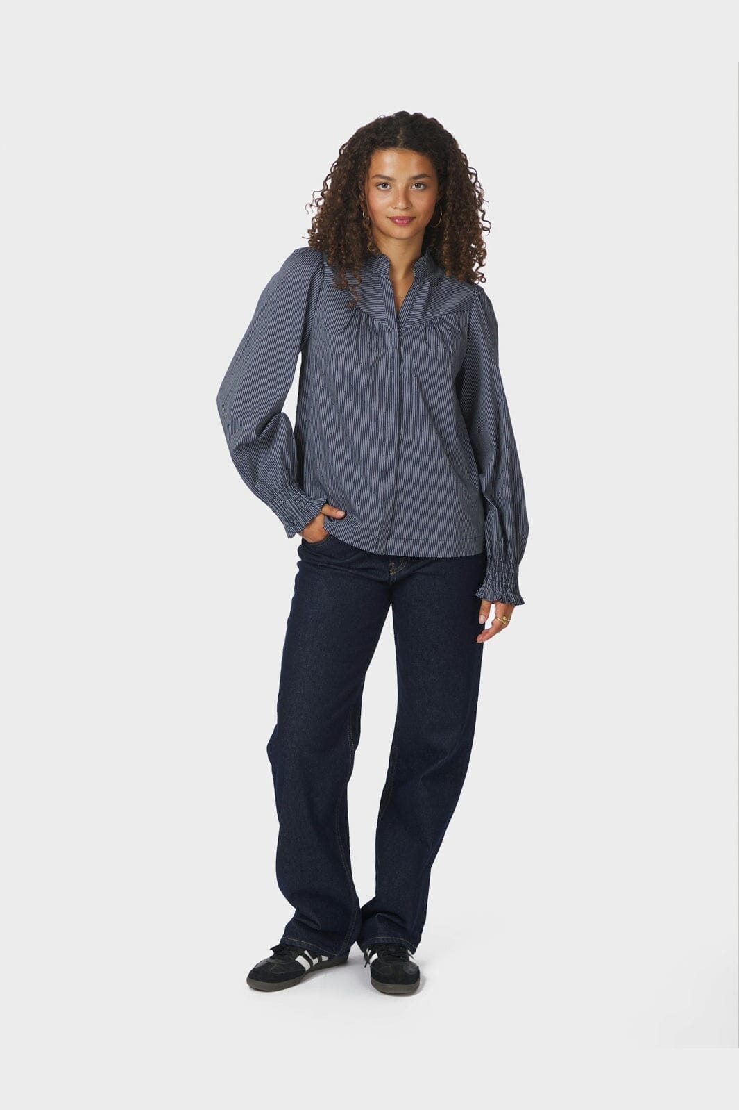 Mörkblå randig blus från Neo Noir med hög krage och långa ärmar. Blusen har smockmanschetter och en liten volangkrage samt knappar framtill för stängning.