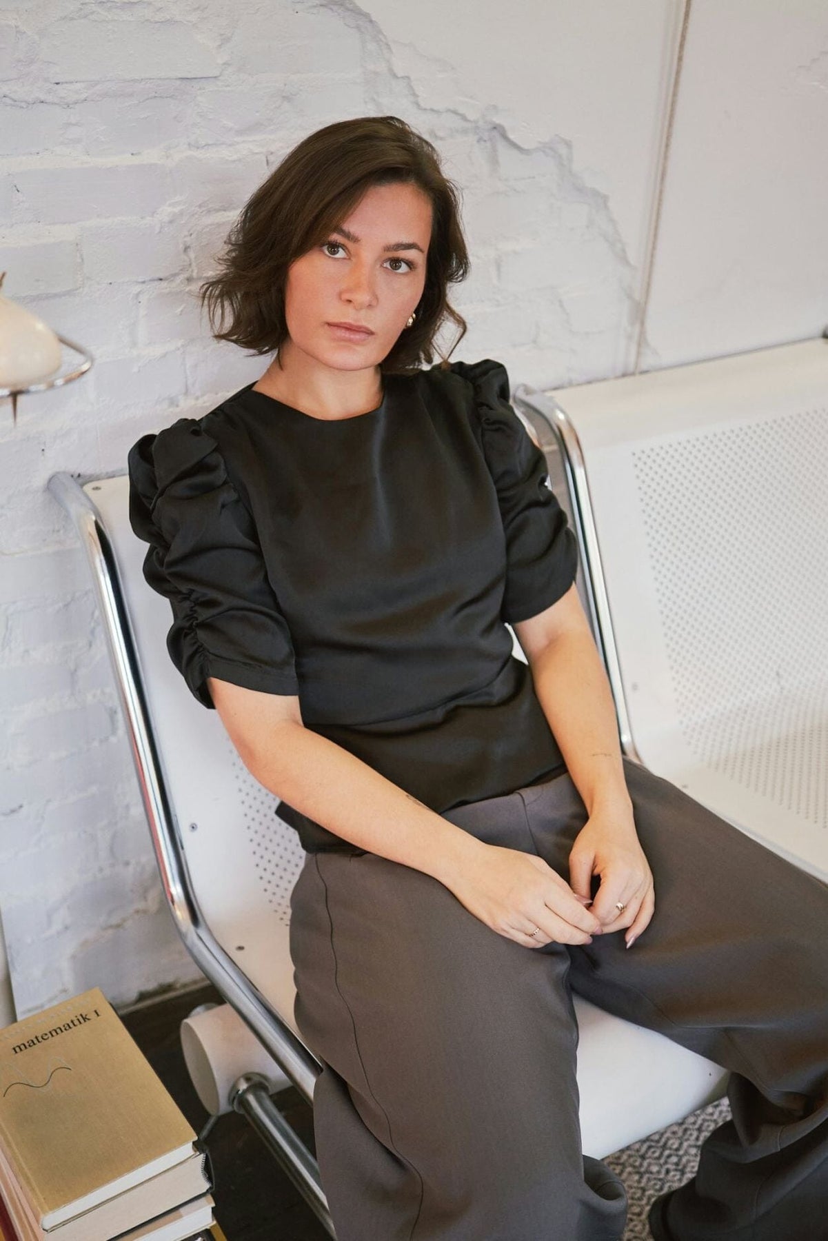 Svart satinblus från Neo Noir med puffiga ärmar och peplumkant. Blusen har en rund hals och korta ärmar med rynkeffekt, vilket ger ett feminint uttryck.