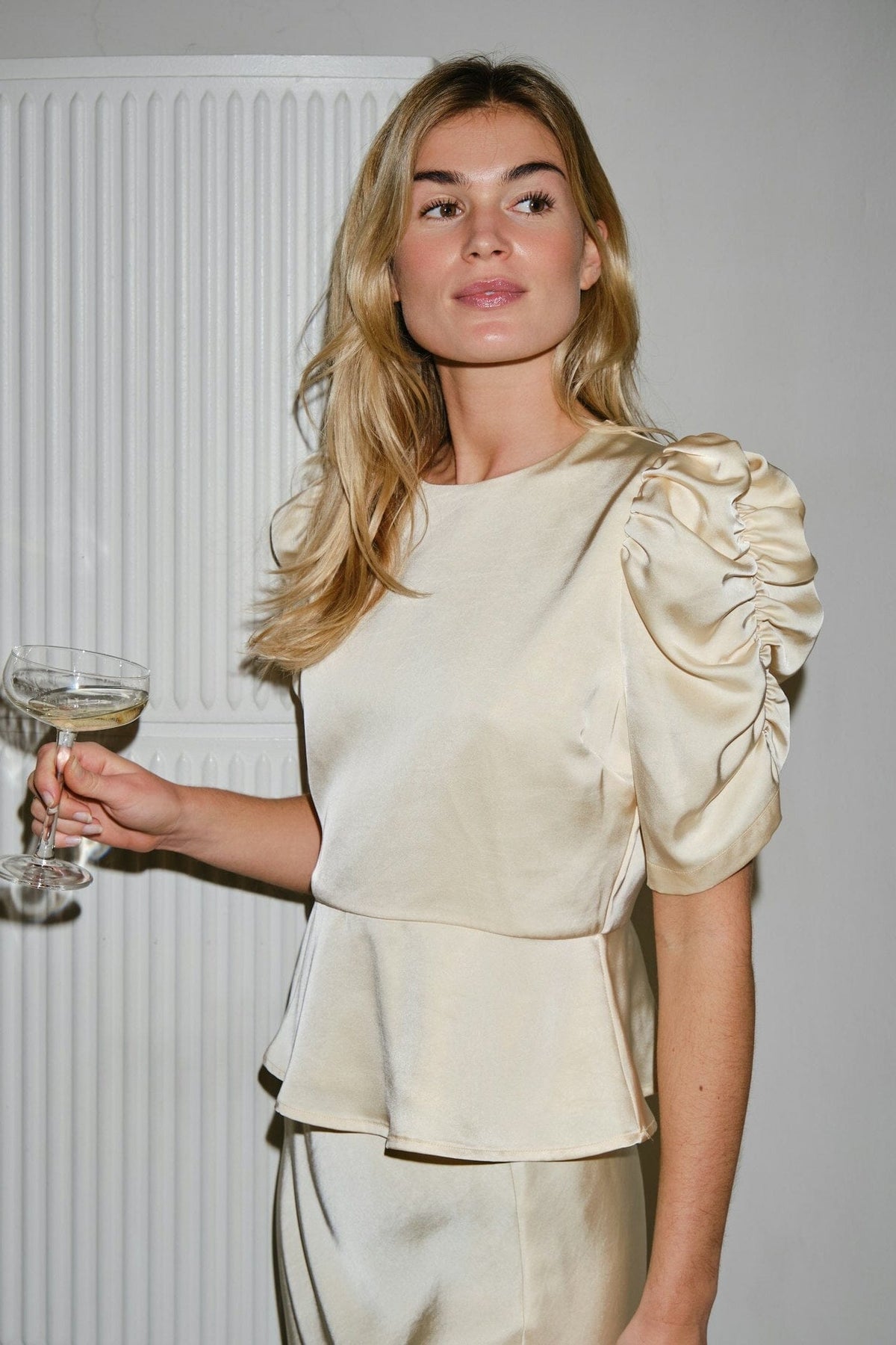 Ljusgul satinblus från Neo Noir med puffärmar och lätt peplumeffekt i midjan. Blusen passar till formella middagar och festliga tillställningar.