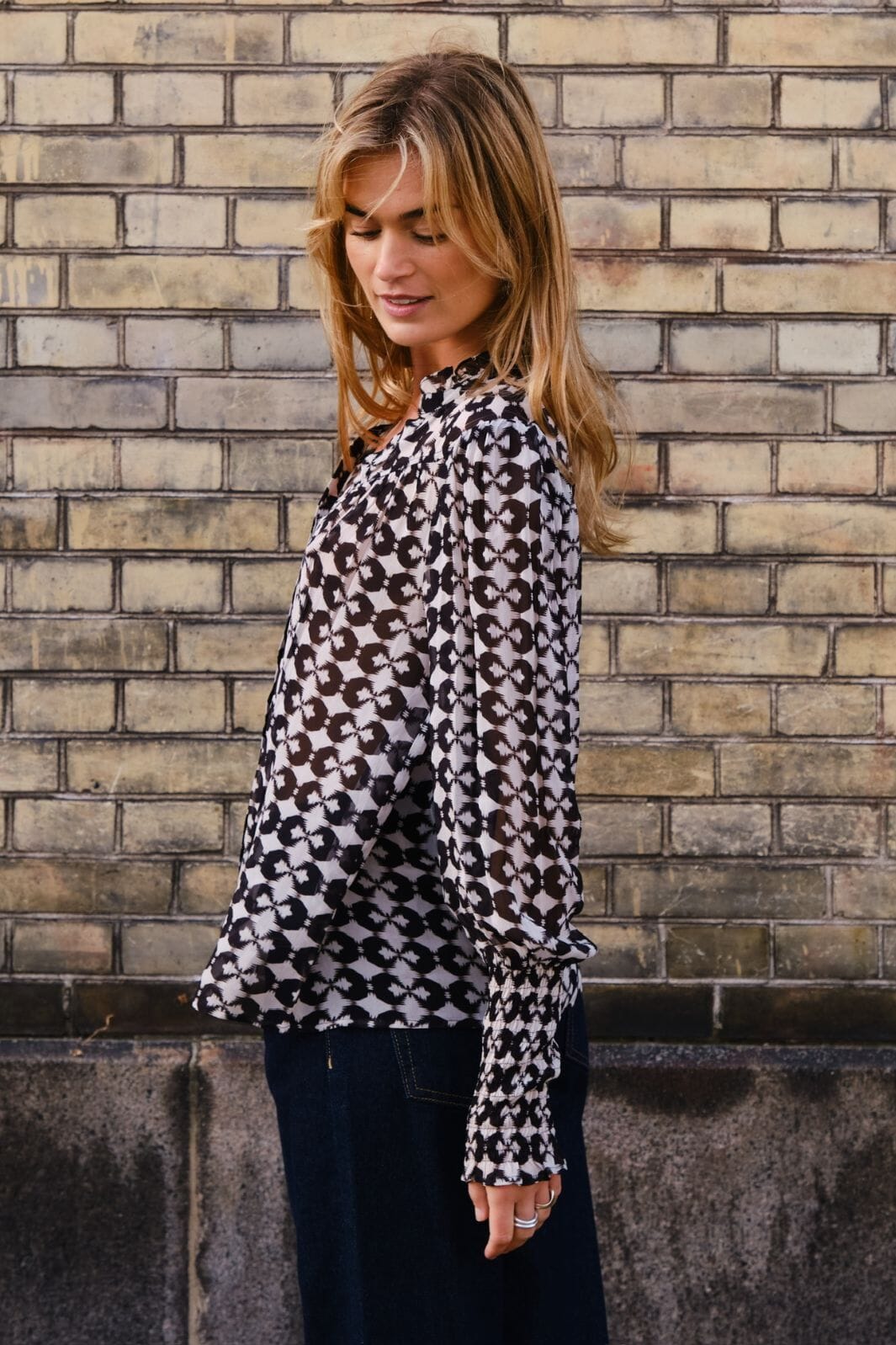 Svart skjorta från Neo Noir med grafiskt svart-vitt mönster. En skjorta med V-ringning och långa ärmar som kan stylas med både jeans och kjol.