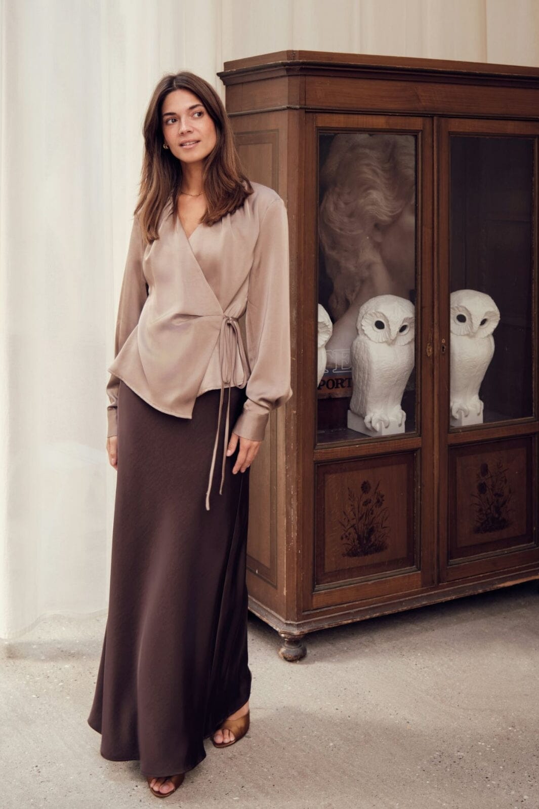 Satinblus från Neo Noir i mörk taupe. Blusen har en lös passform med omslagdesign och bindband i sidan.