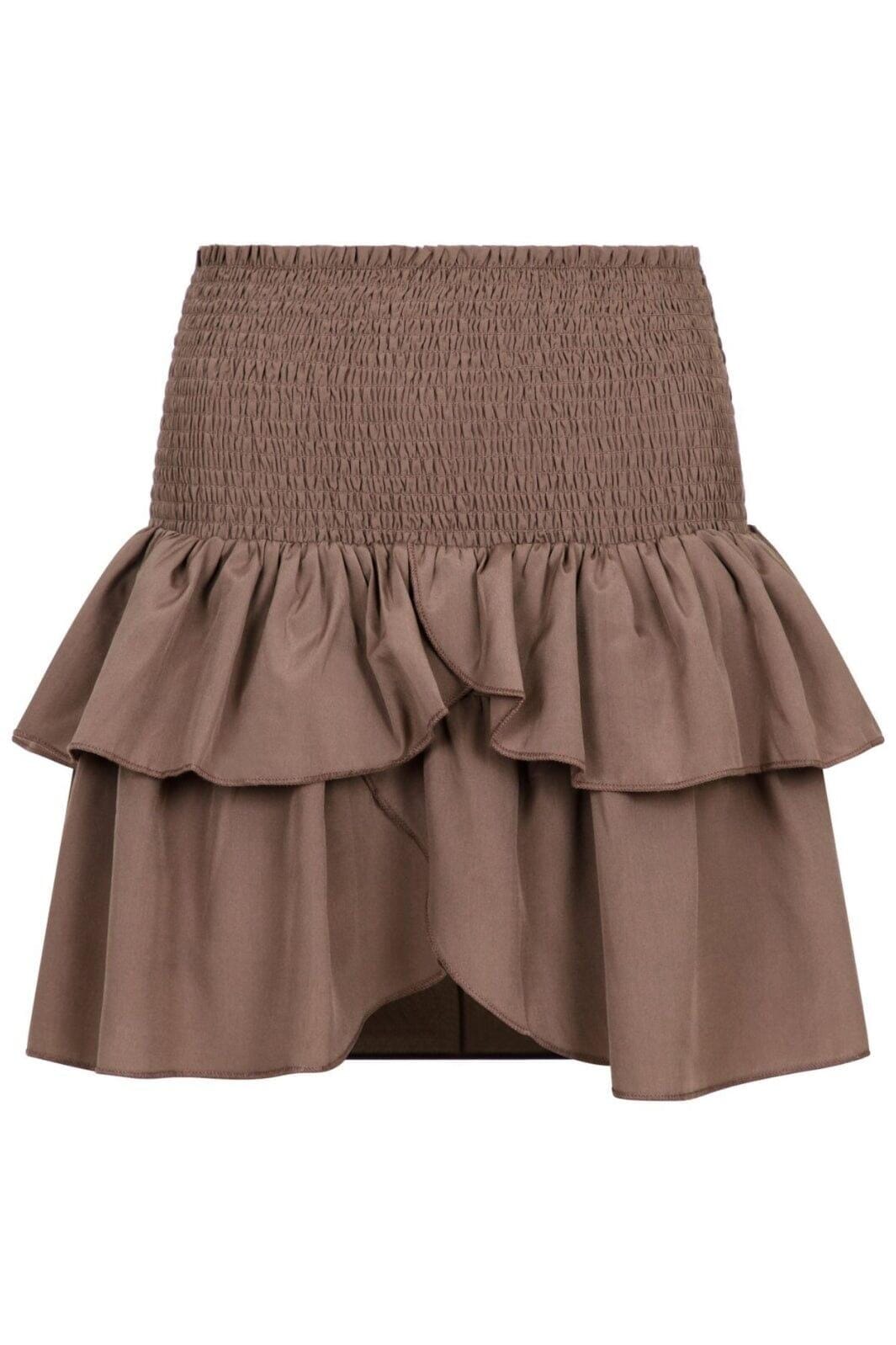 Dammig brun kjol från Neo Noir med två lager volanger och smockad midja. Den höga midjan och korta längden ger kjolen ett dynamiskt uttryck.