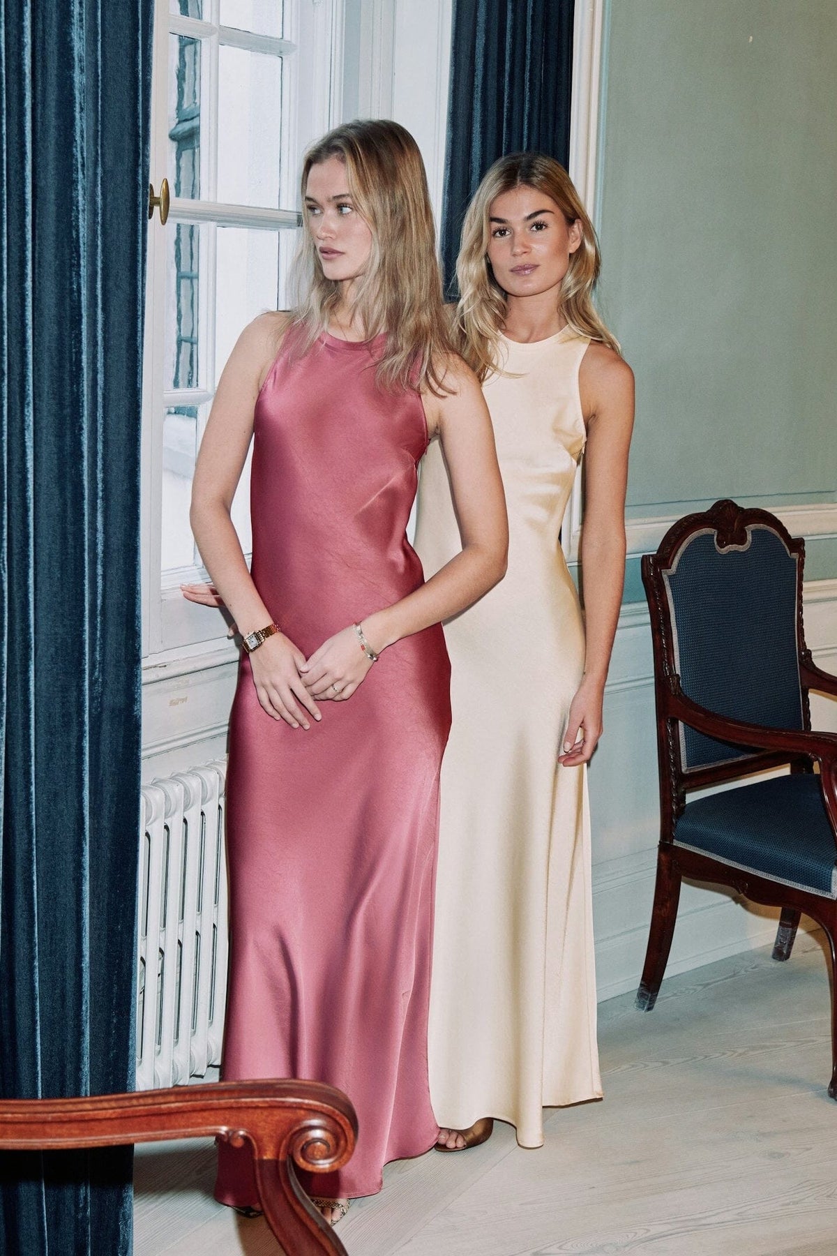 Lång rosa klänning från Neo Noir, tillverkad i kraftig satin. Klänningen har en smal passform och är ärmlös med rund halsringning.