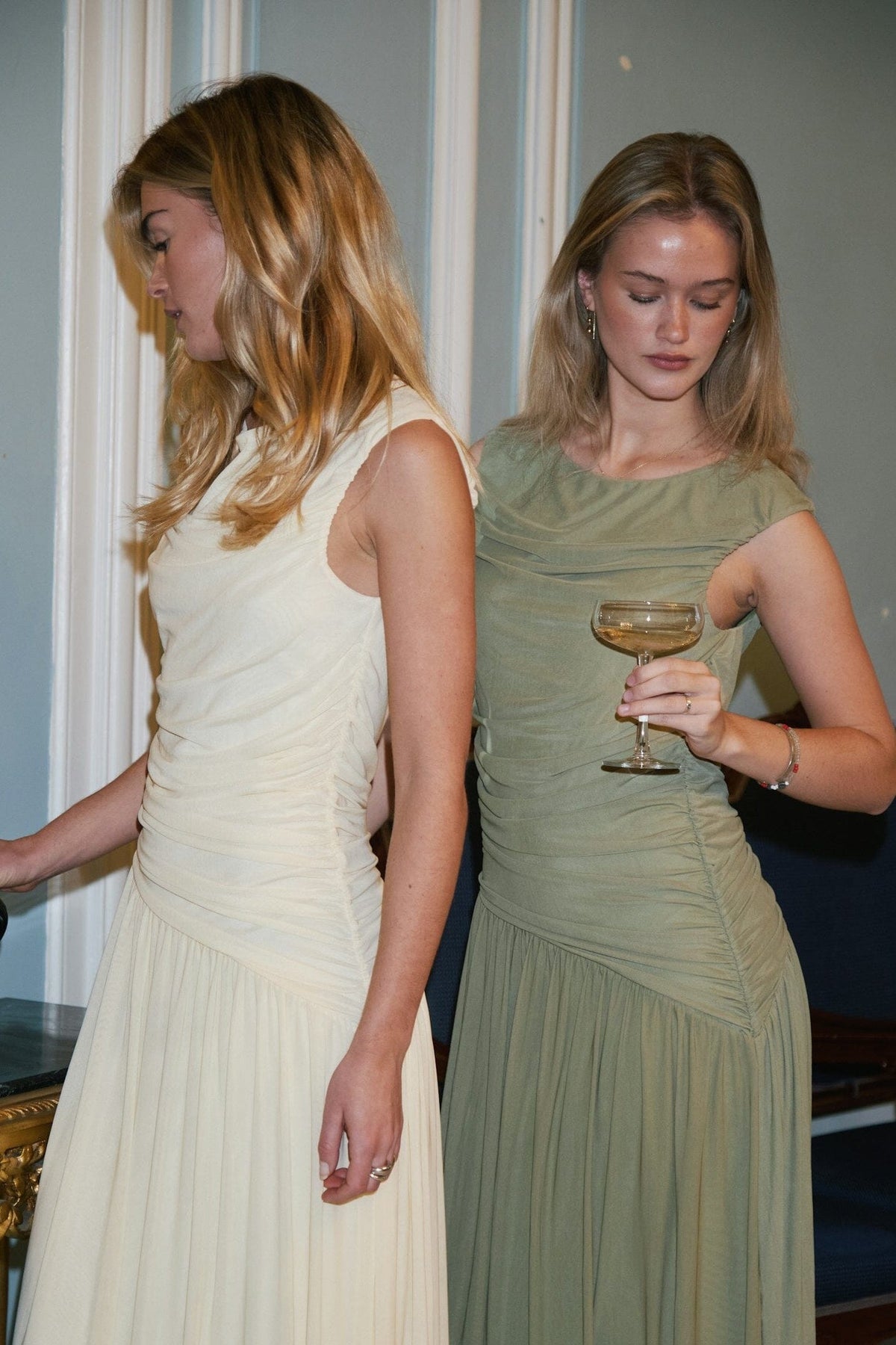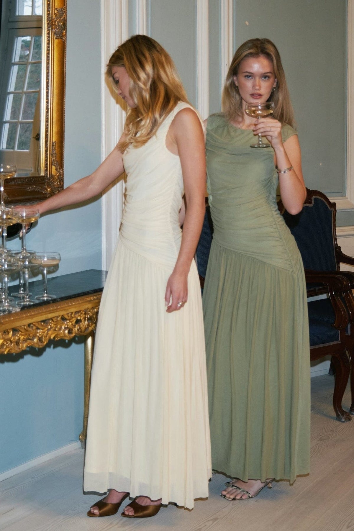 Meshklänning från Neo Noir i en salviagrön färg. Klänningen har rynkor längs sidosömmen och en lös underklänning med asymmetriskt skuren nederdel.