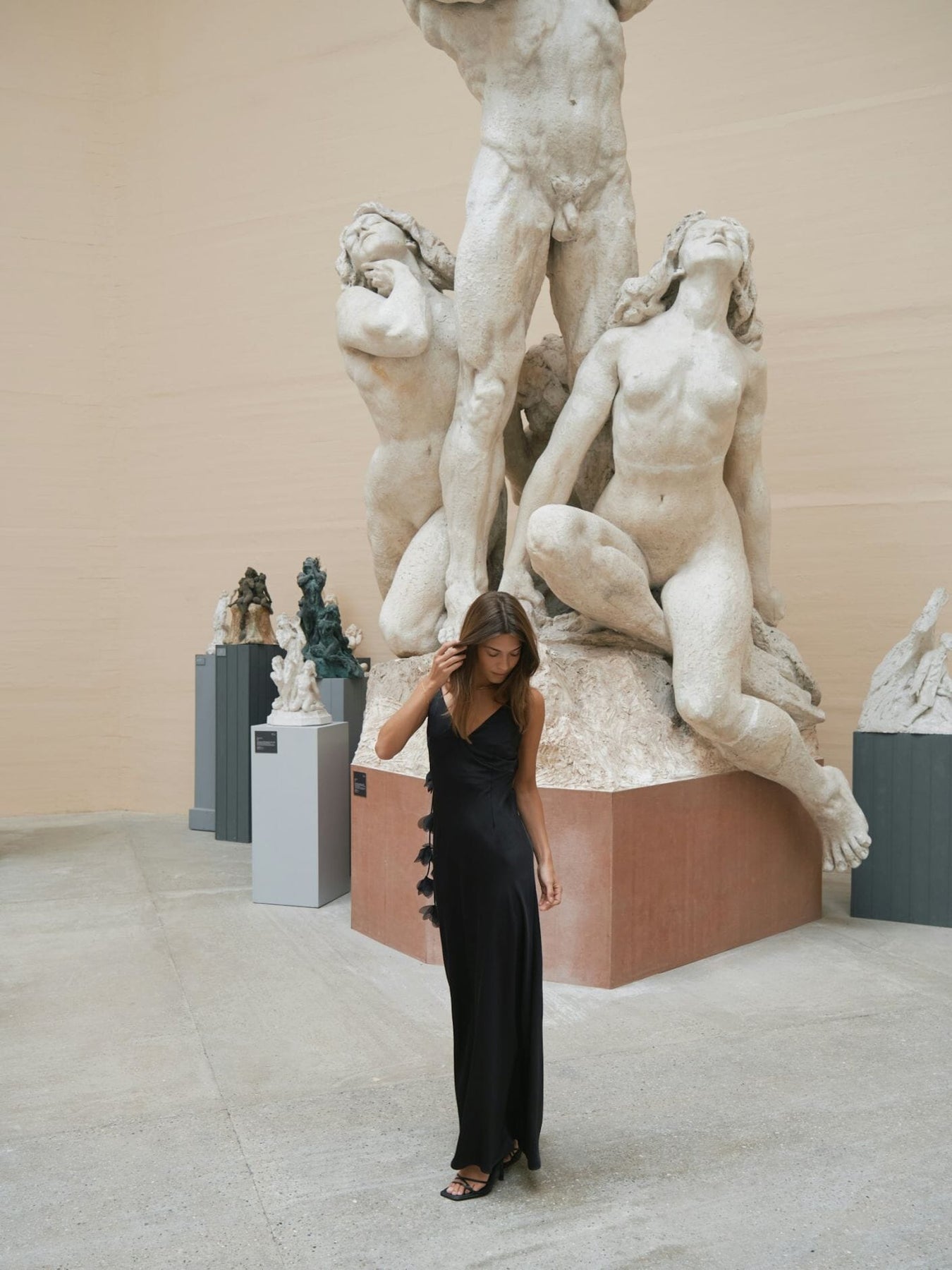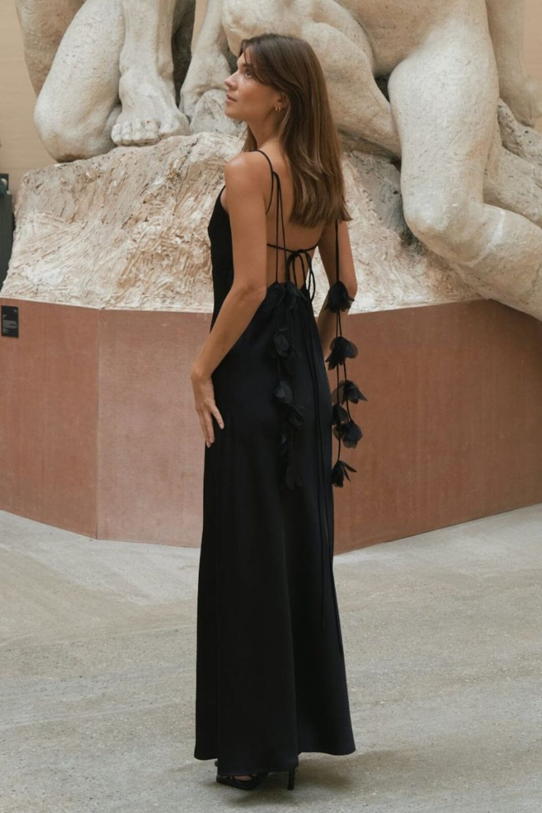Svart golvlång klänning från Neo Noir i tung crepe-satin. Klänningen har V-ringning, spaghettiband med blomsterdetaljer och snörning på ryggen.