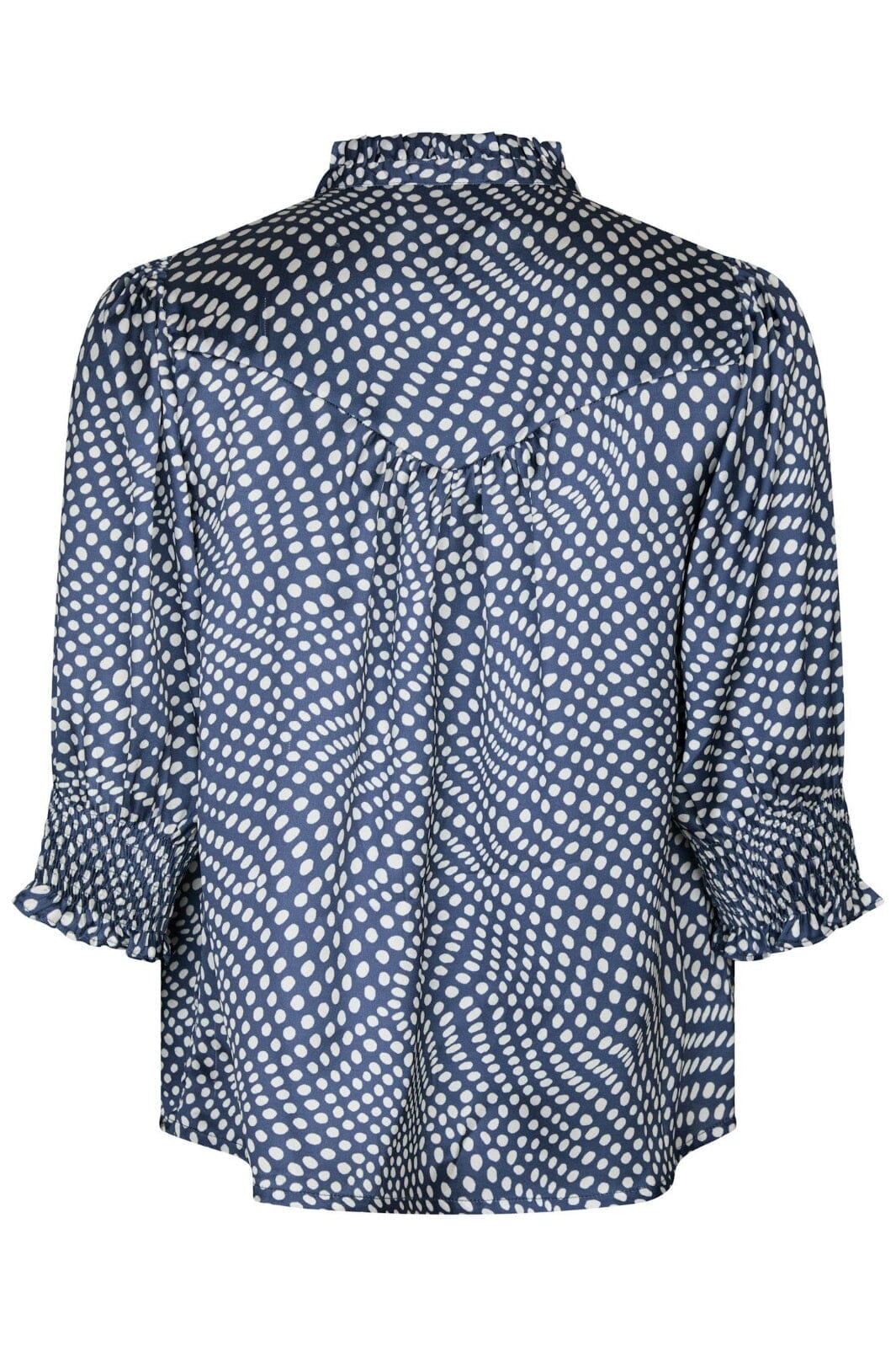 Mörkblå blus från Neo Noir med vita prickar. Blusen har en v-ringning med volangkant och 3/4 puffärmar med volangdetaljer vid ärmslutet.