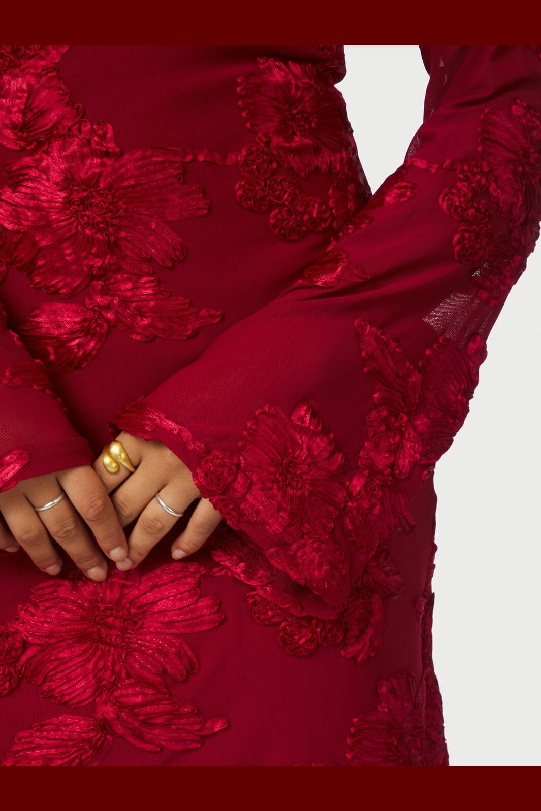 Röd meshklänning från Neo Noir med stora blommor i broderat mönster. Klänningen har en A-formad silhuett och långa ärmar med rund hals. Det fina meshtyget har ett dekorativt blommönster i burgundynyanser.