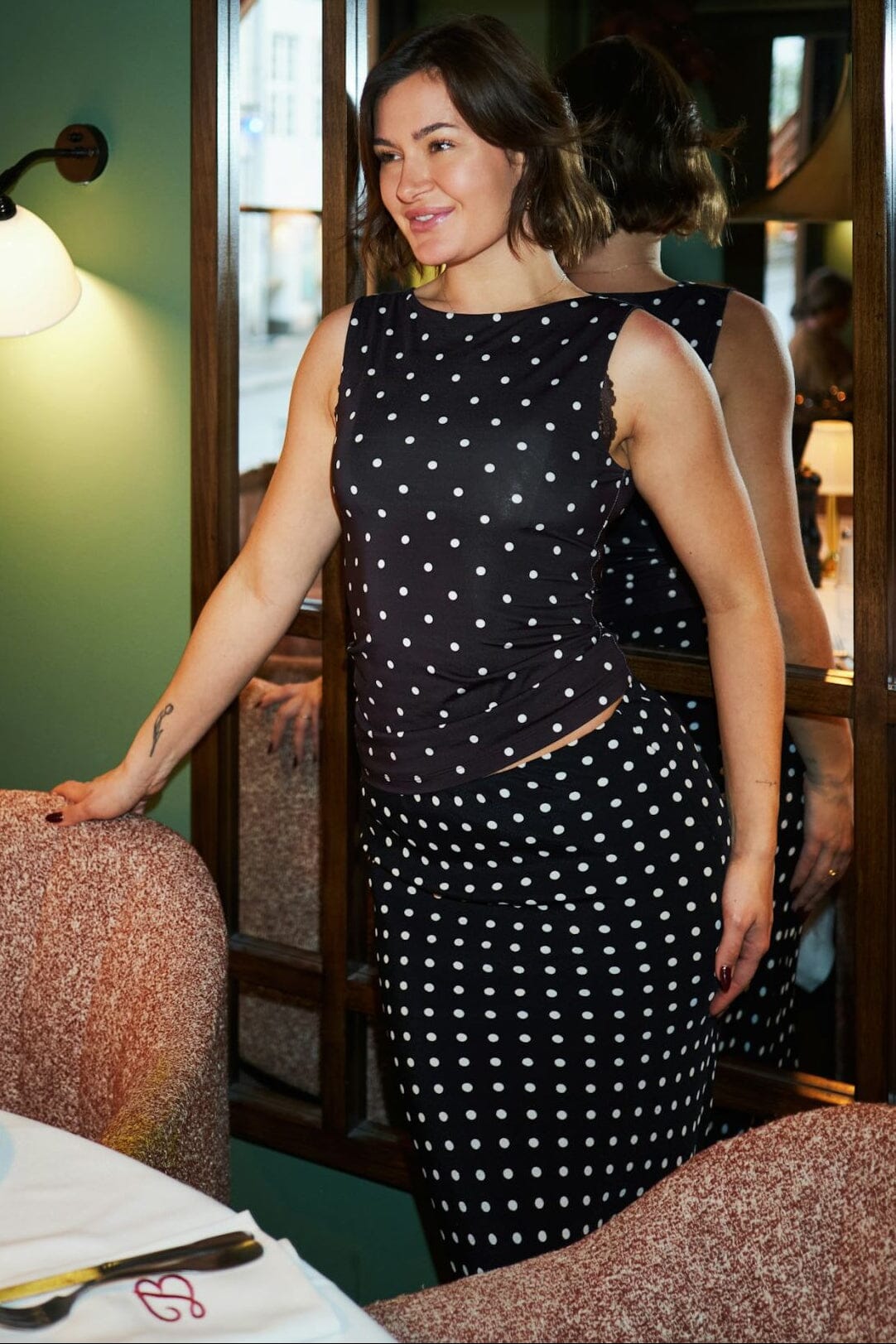 Svart jersey-top från Neo Noir med vita prickar. Toppen har en rund halsringning och är utan ärmar. Tyget är stretchigt och följer kroppens form.