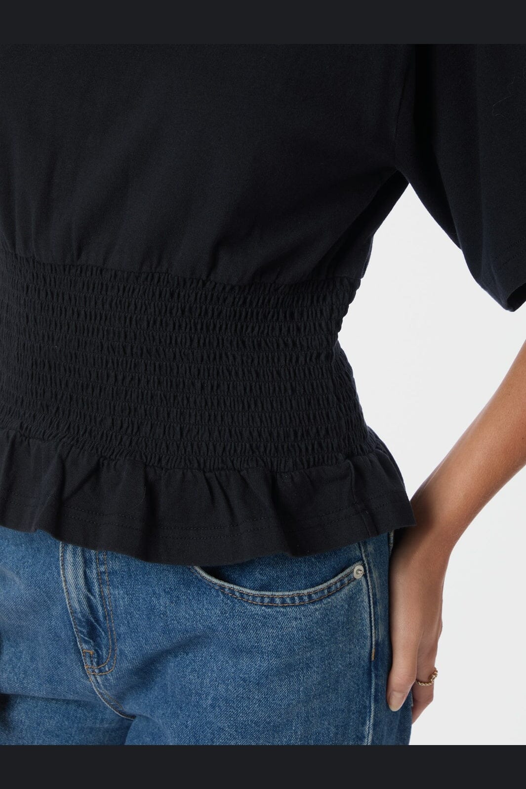 Mörkblå T-shirt från Neo Noir med boxy passform och smock-detalj i midjan. Den är gjord i mjuk bomullskvalitet och har korta ärmar samt en rund halsringning.