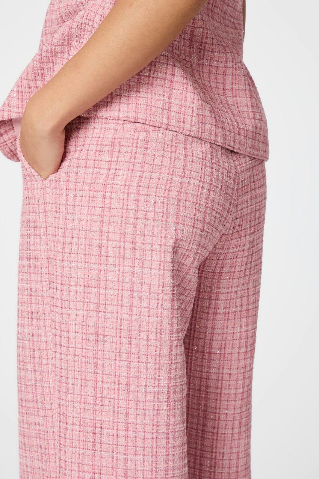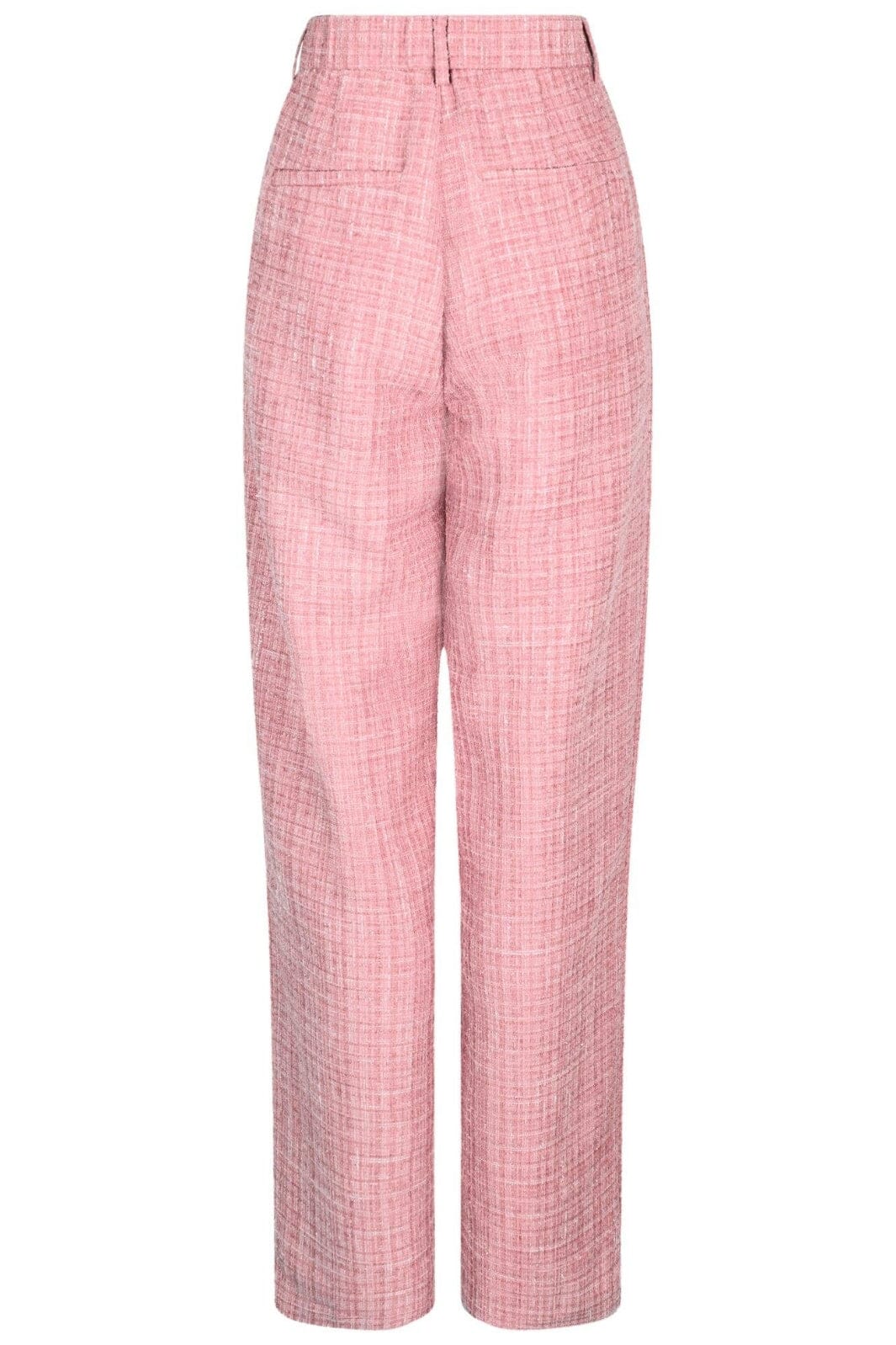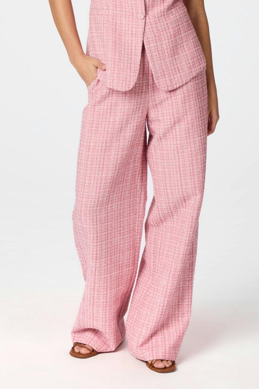 Rosa byxor från Neo Noir i boucle-kvalitet. Byxorna har hög midja och vida ben med en lös passform. De är designade med knappar och ett rutigt mönster.