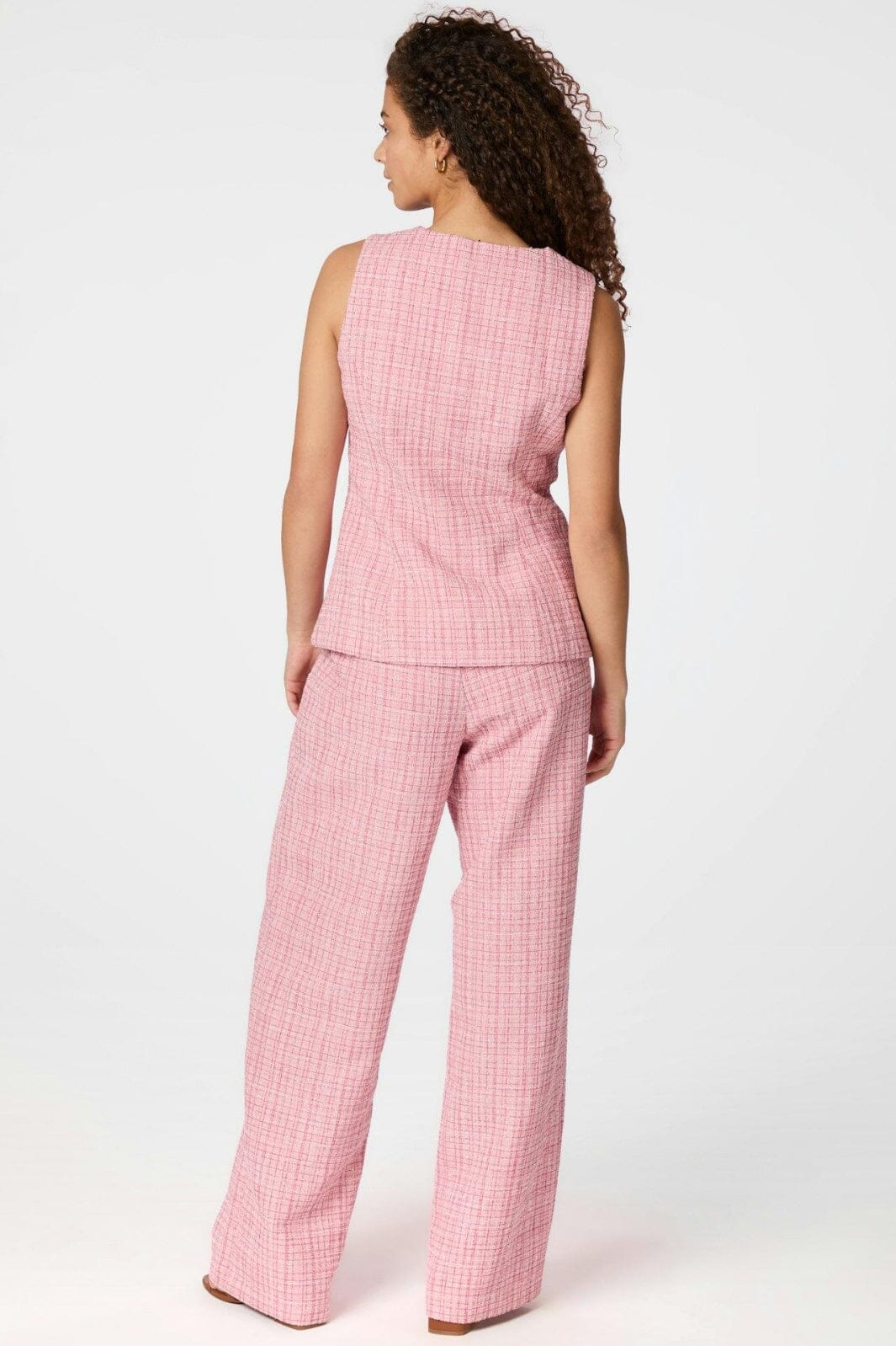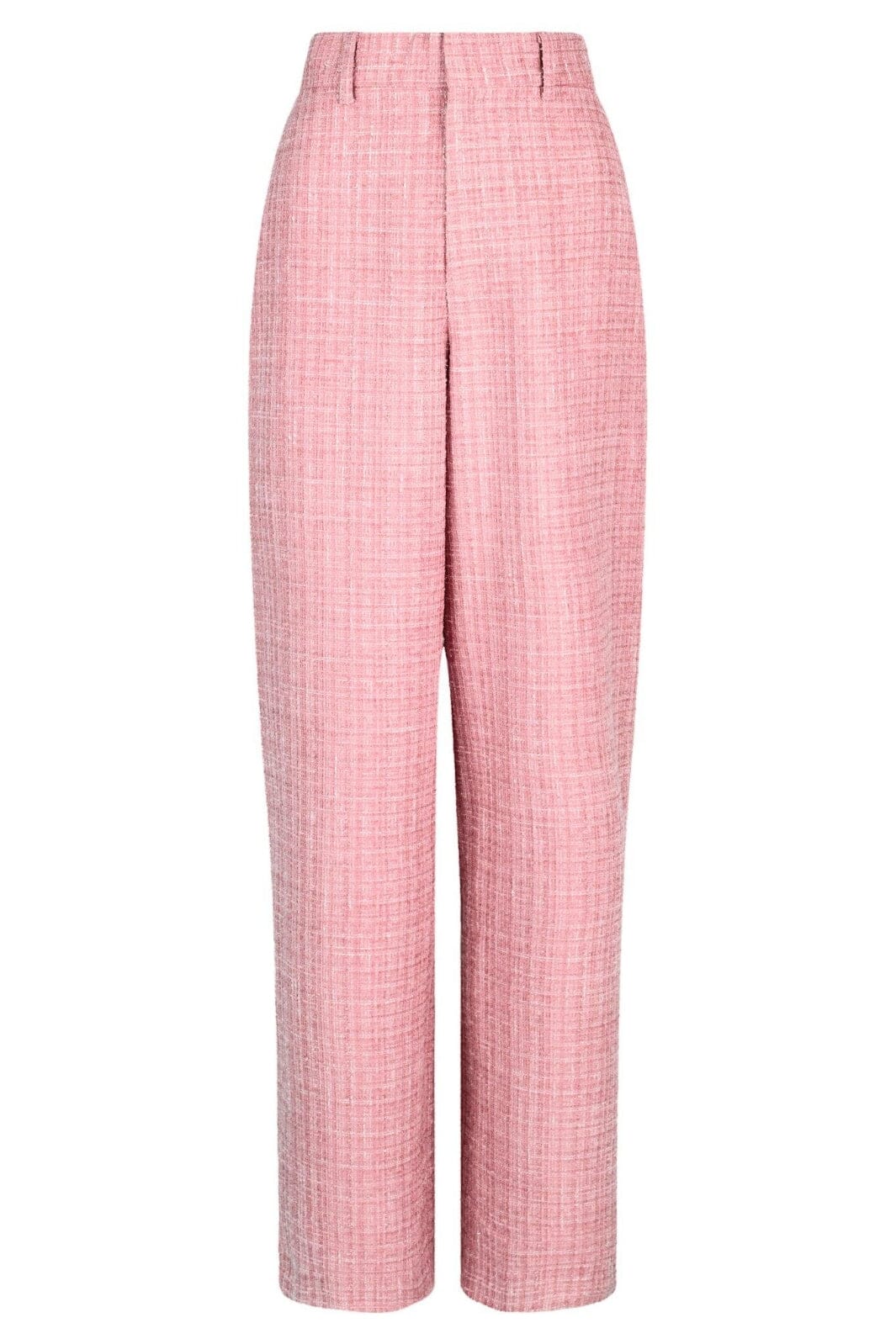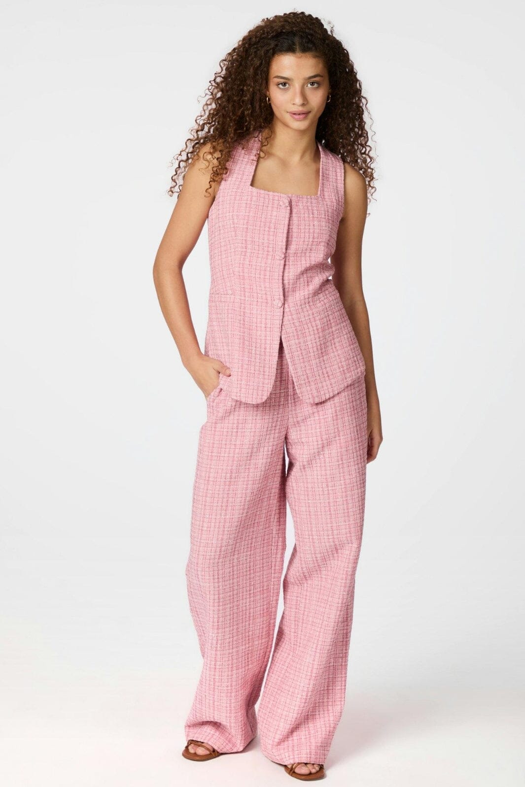 Rosa byxor från Neo Noir i boucle-kvalitet. Byxorna har hög midja och vida ben med en lös passform. De är designade med knappar och ett rutigt mönster.
