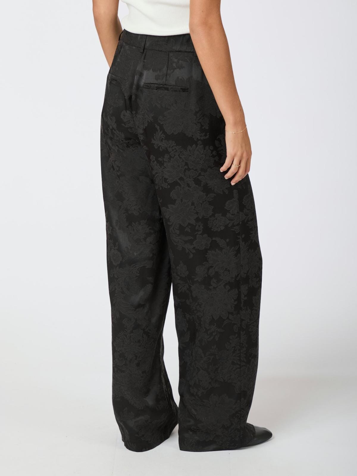 Svarta jacquardbyxor från Neo Noir med blommönster i tygets textur. Byxorna har en rak passform och går hela vägen ner till golvet.