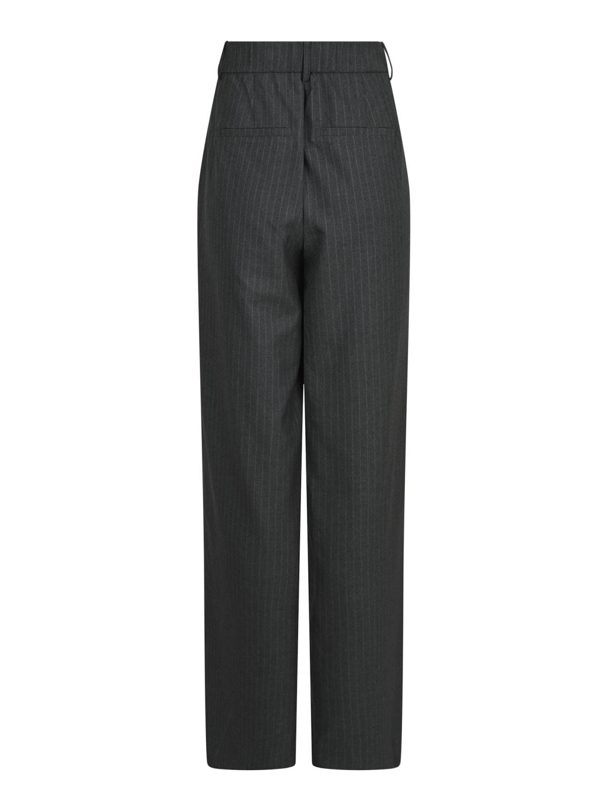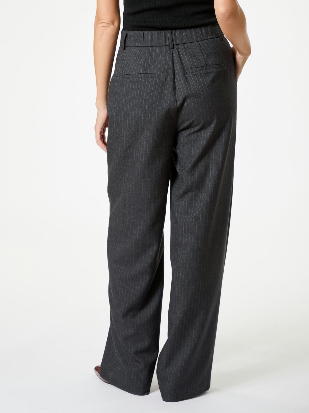 Antracitfärgade byxor med nålrandigt mönster från Neo Noir. Byxorna har en bred benstil och går ner till golvet. De stängs med dragkedja och knappar i midjan.