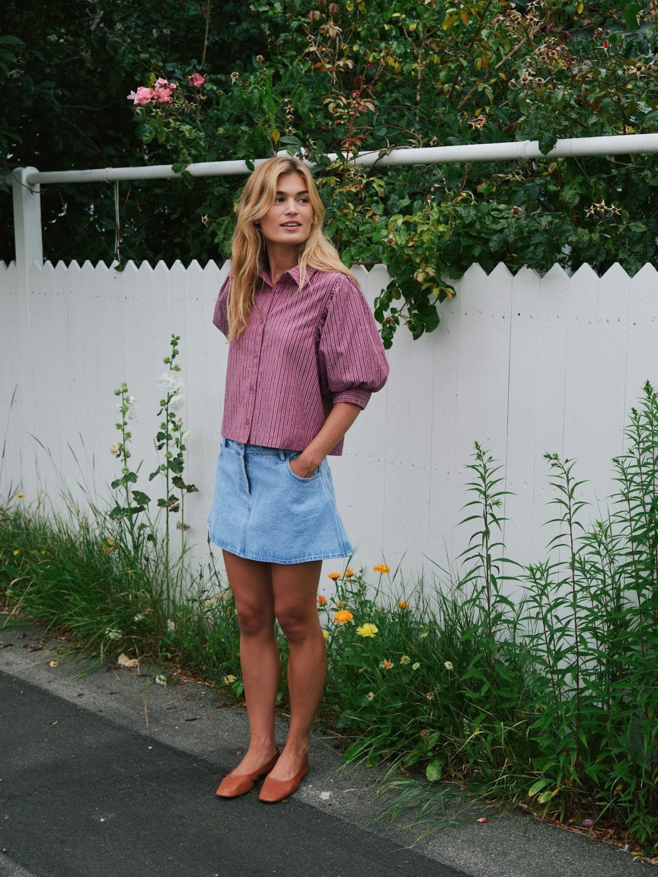 Fin randig skjorta med korta puffärmar och knappar framtill. Modellen är 176 cm lång och bär storlek 36.