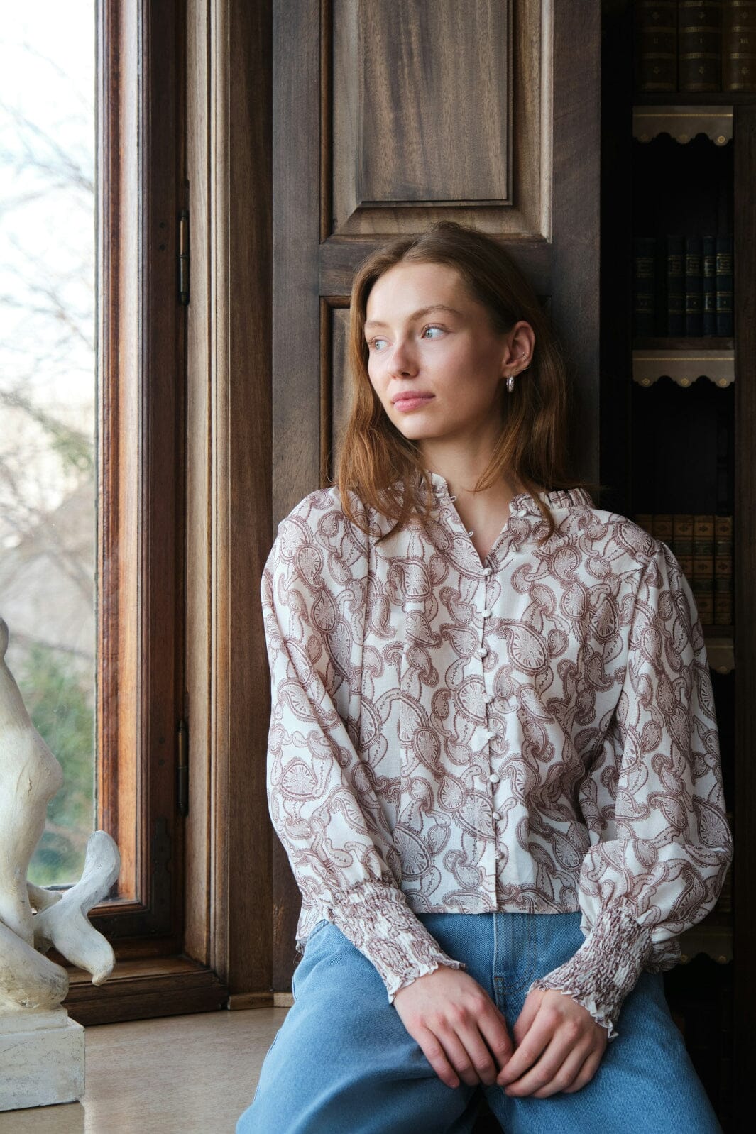 Krämfärgad blus från Neo Noir med paisleymönster. Blusen har en hög halsringning med volangkant, långa ärmar med smock vid manschetterna och knappar fram.