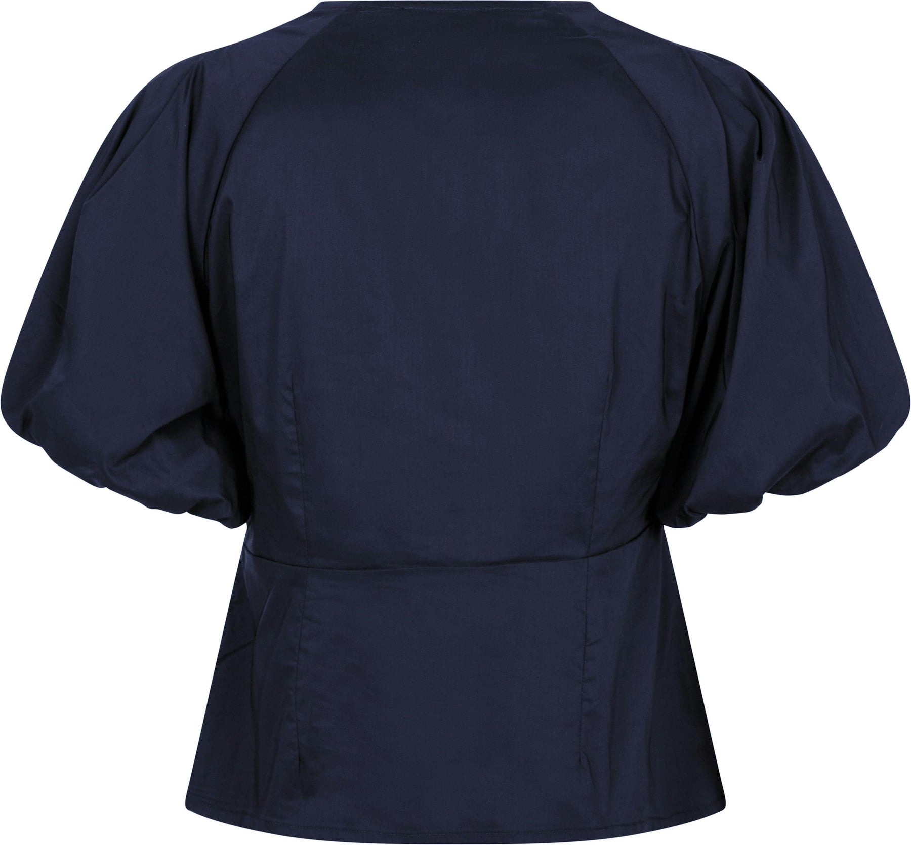 Mörkblå poplinblus från Neo Noir med V-ringning och volangkant. Blusen har puffärmar och en figursydd passform med dold dragkedja i sidan.