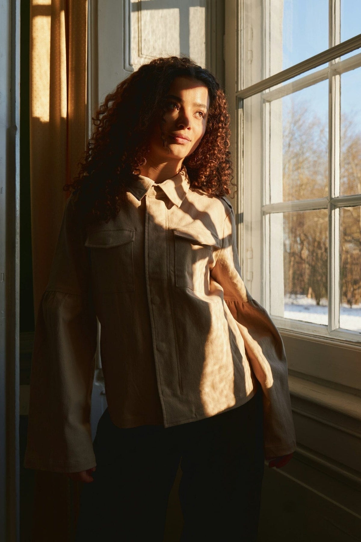 Sandfärgad jacka från Neo Noir, tillverkad av 90 % bomull, 8 % polyester och 2 % elastan. Jackan har en klassisk skjortkrage, två bröstfickor med lock och långa ärmar med puffdetalj vid axlarna.