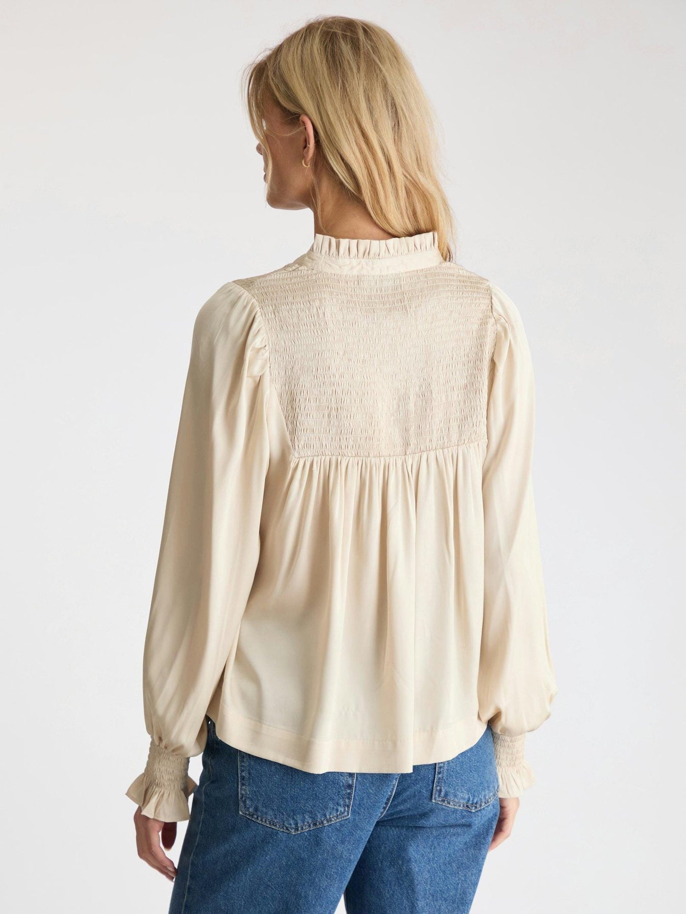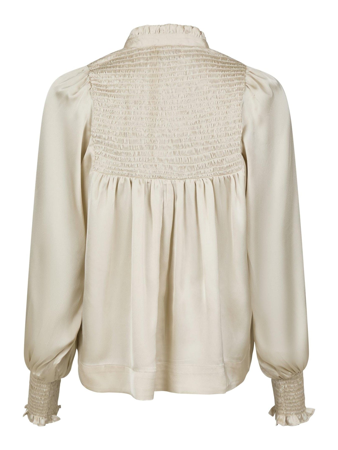Satinblus från Neo Noir i champagnefärg. Blusen har rynkade detaljer vid axlarna och smockdetaljer på bröstet. De långa ärmarna avslutas med elastik vid handlederna.