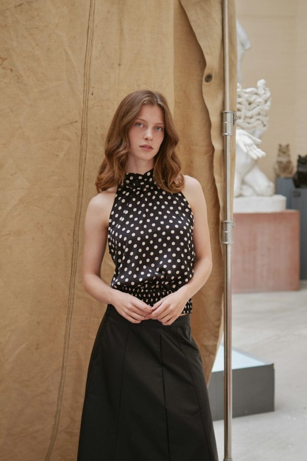 Svart topp från Neo Noir med vita polka prickar. Toppen har hög halsringning och halterneck-design med bindband. Smockdetaljer vid botten ger en bra passform.