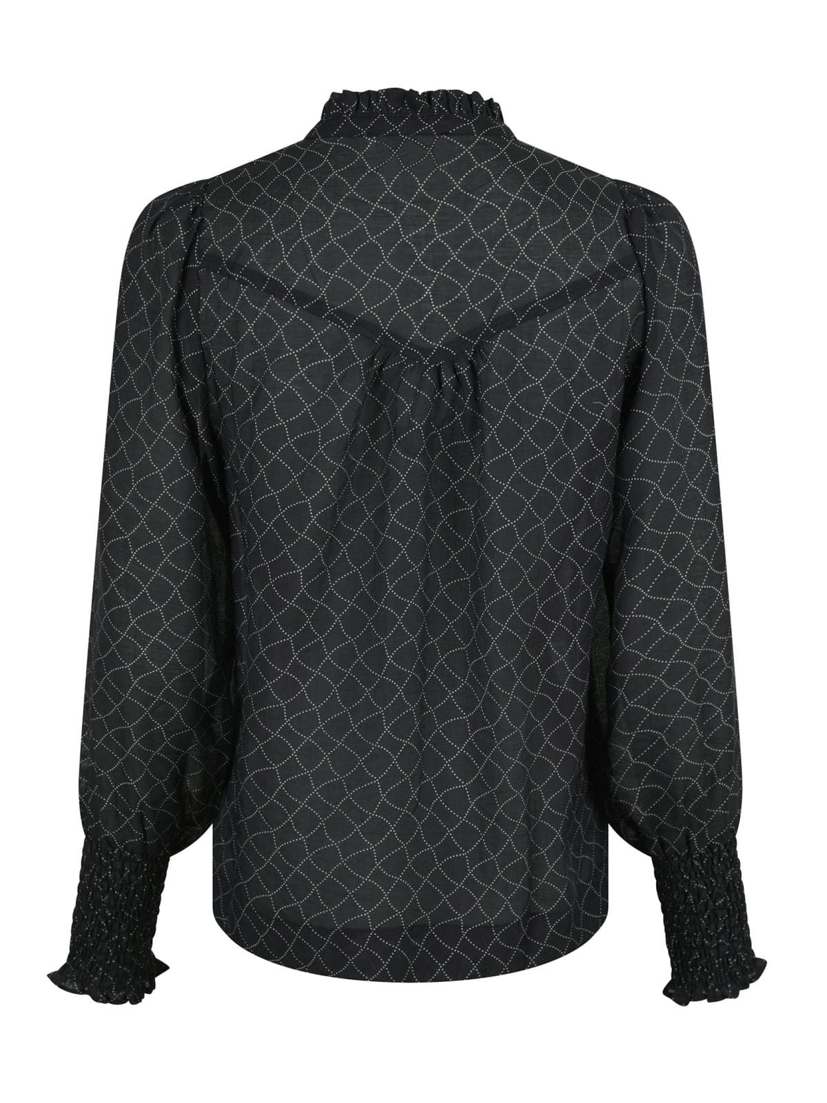 Svart blus från Neo Noir med ett geometriskt mönster i ljusare nyanser. Blusen har en hög hals med volanger.