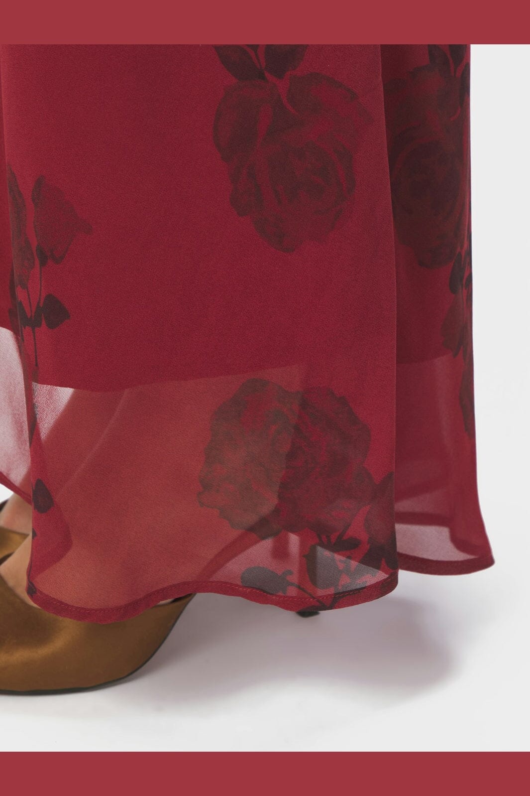 Mörkröd maxiklänning från Neo Noir i chiffong med blommönster. Klänningen har rund halsringning, volangdetaljer och en genomskinlig kant nedtill.