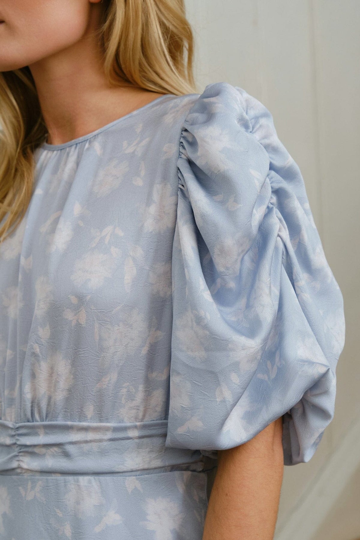 Lång klänning från Neo Noir i en ljusblå nyans med blommigt print. Klänningen har 3/4-ärmar, rund halsringning och dekorativa sömmar.