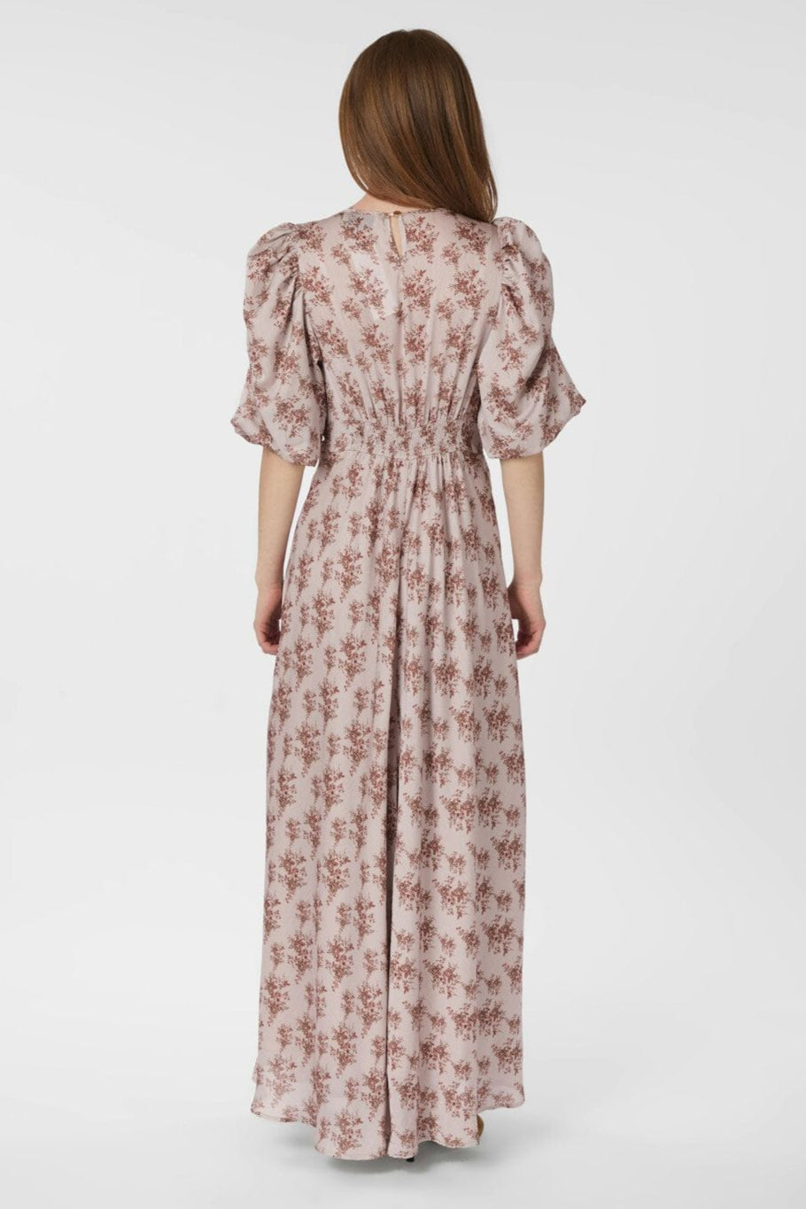 Vacker, feminin lång klänning med ett vackert rosentryck. Klänningen har 3/4 ärmar och smock i midjan bak. Klänningen har knäppning i nacken. Modellen är 176 cm och bär storlek 36.